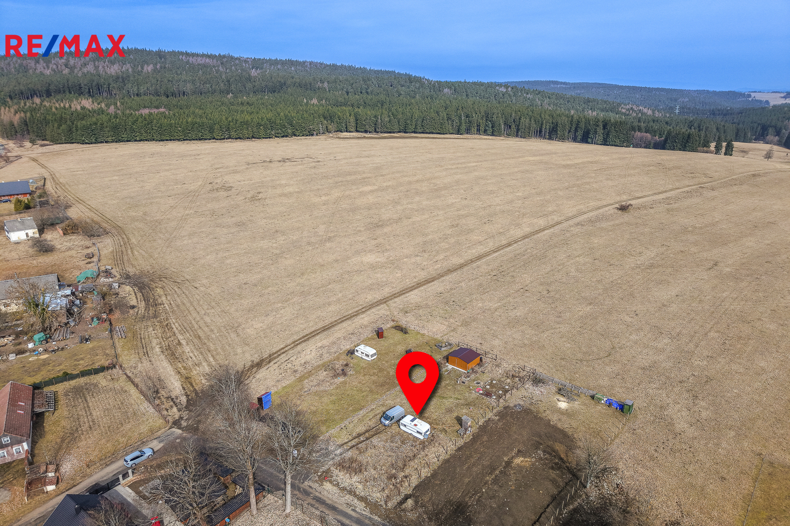 Na pozemku se nachází plechová garáž (aktuálně využívaná jako sklad materiálu).