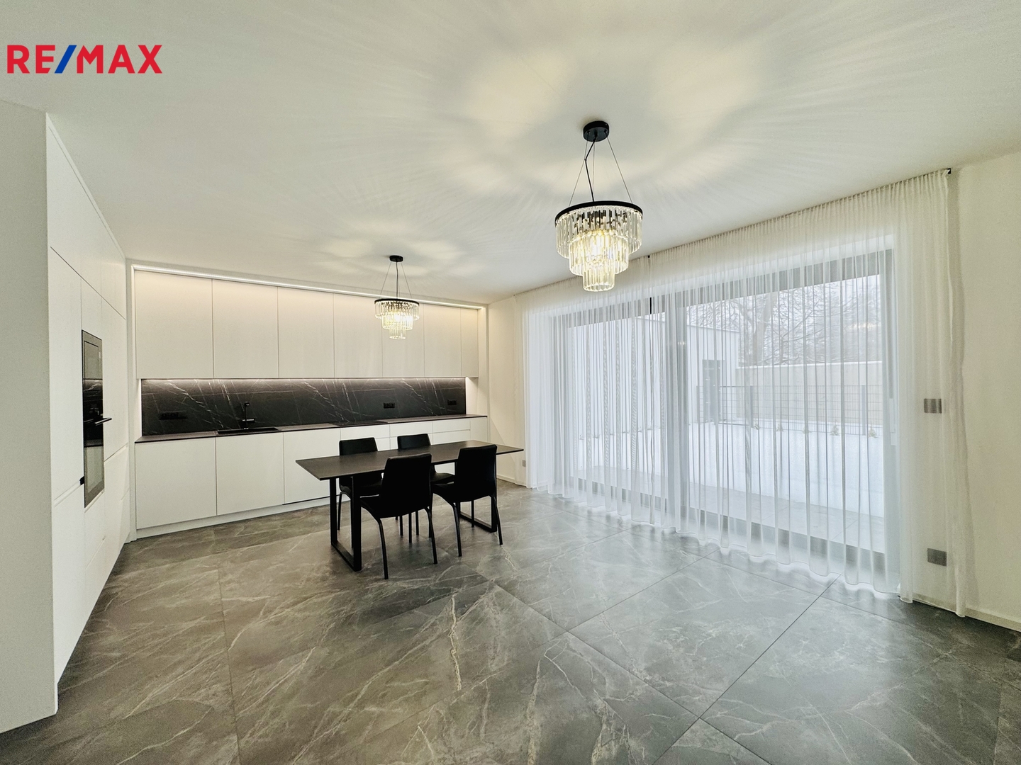 Srdcem bytu je elegantní a světlý obývací prostor, vybavený televizí, jídelním stolem a židlemi, který plynule navazuje na plně vybavenou designovou kuchyni. Ta disponuje moderními spotřebiči včetně myčky, indukční varné desky, trouby, lednice s mrazákem, odsavače par a stylového LED osvětlení. Přímý vstup na rozsáhlou předzahrádku vytváří ideální místo pro relaxaci, posezení s rodinou i klidné večery.