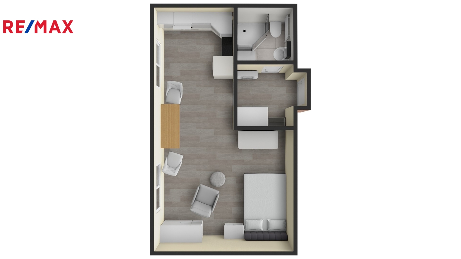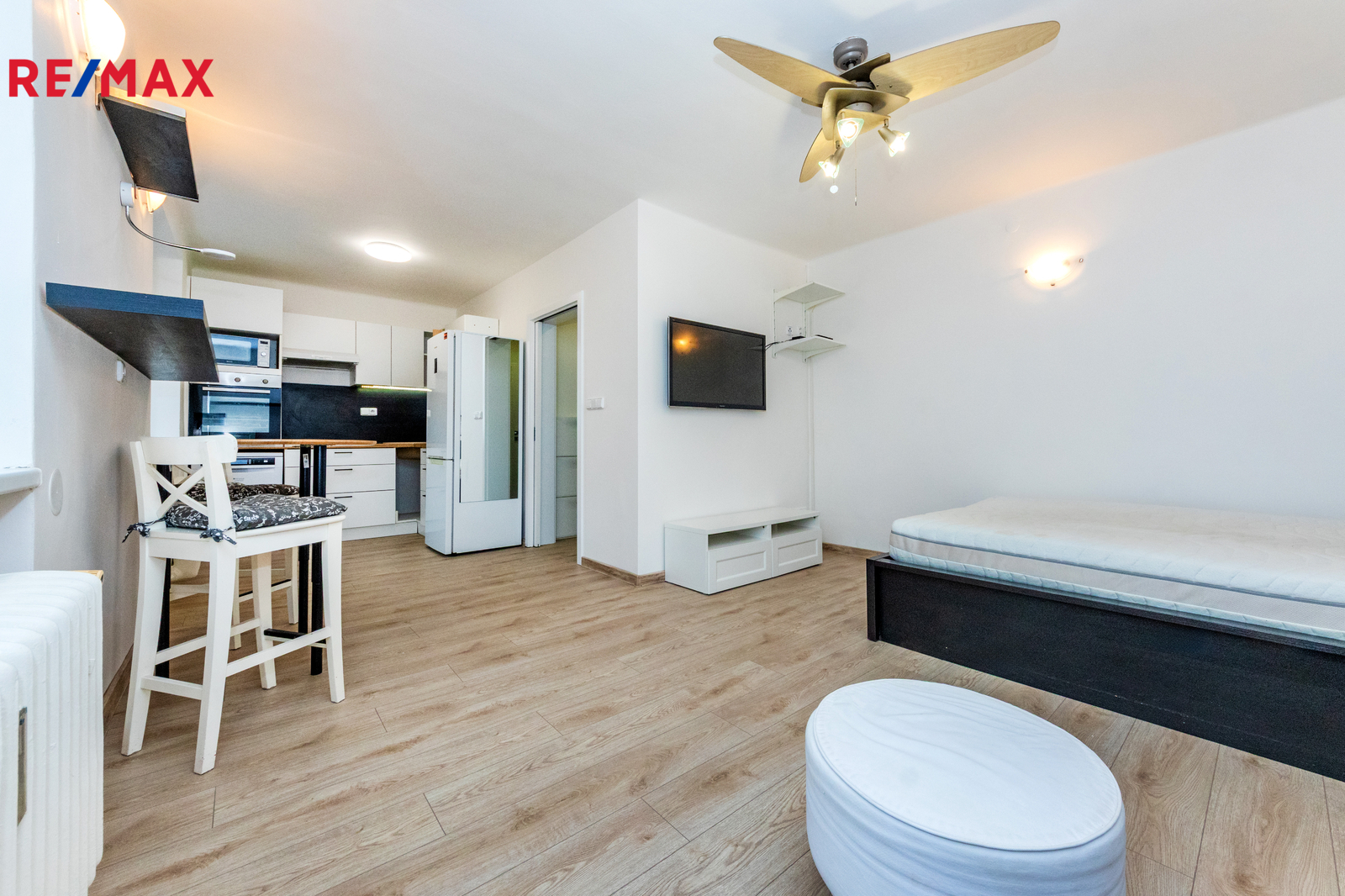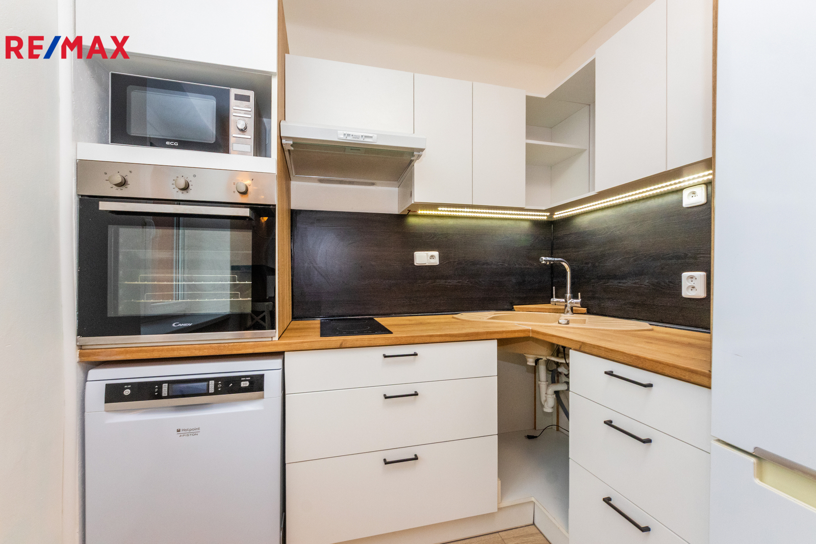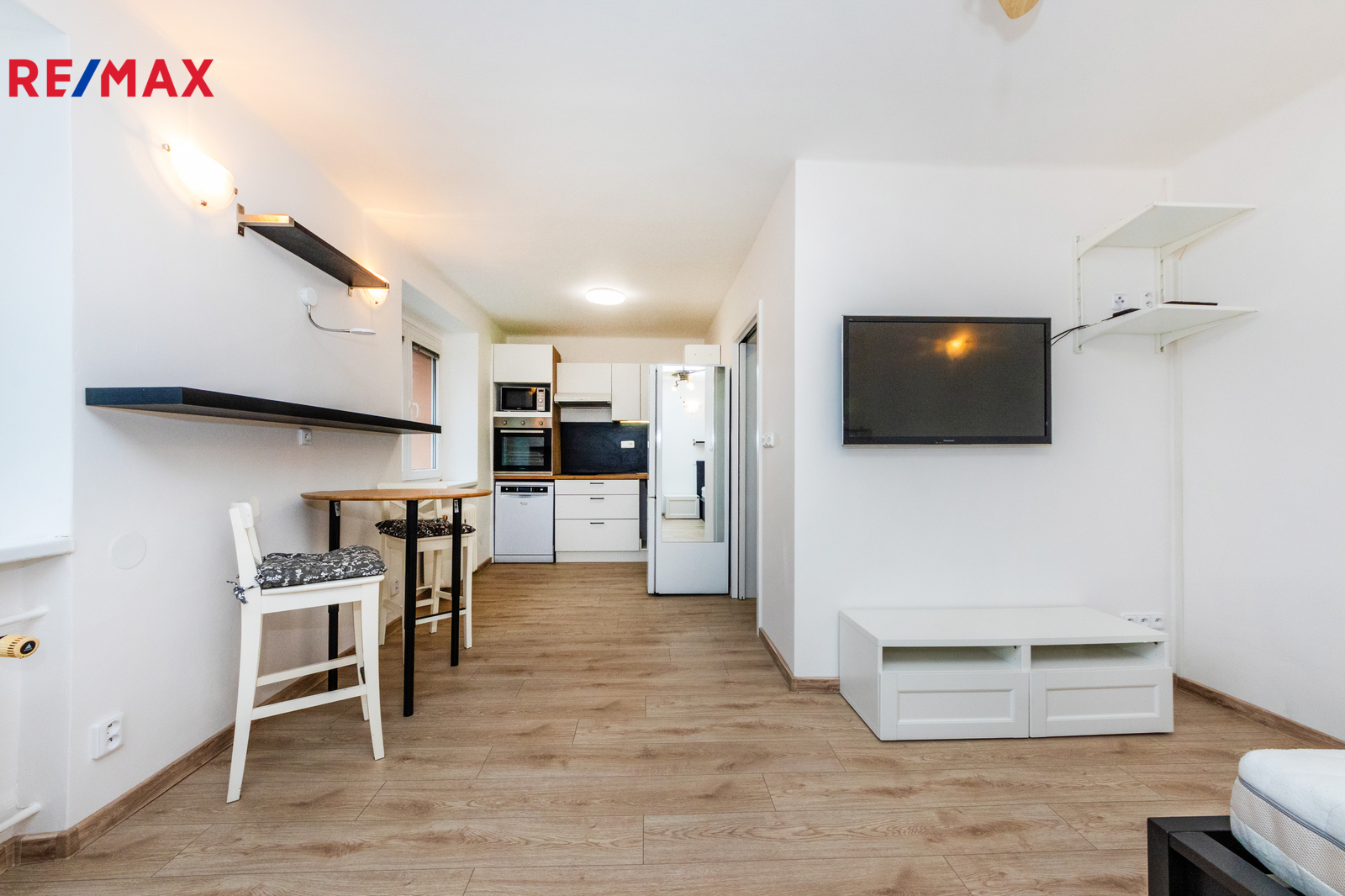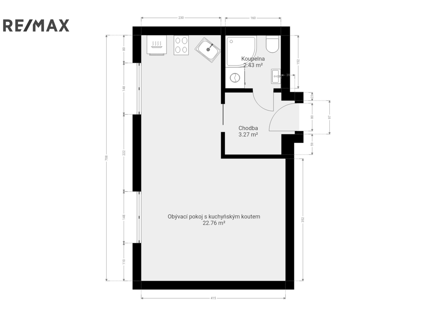 V celkově zrekonstruovaném bytě v roce 2025 se z chodby (3,27 m²) dostanete do pokoje s kuchyňským koutem (22,76 m²) a do koupelny (2,43 m²) se sprchovým koutem, pračkou a WC. Byt je kompletně vybaven takto: