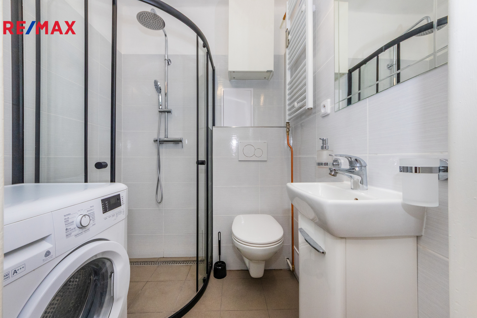 Koupelna: pračka BEKO, sprchový kout, otopný žebřík, WC;