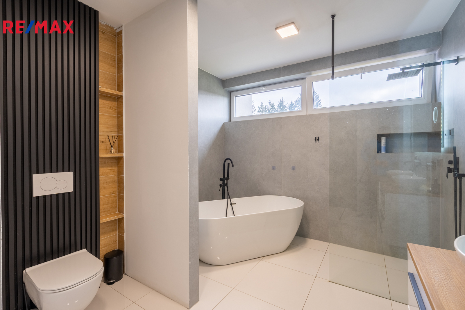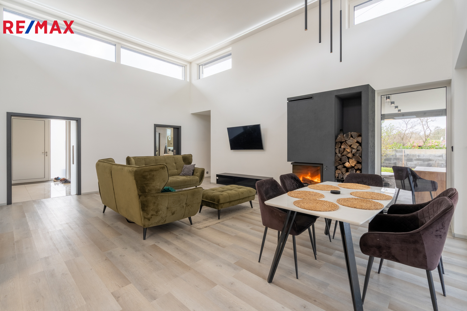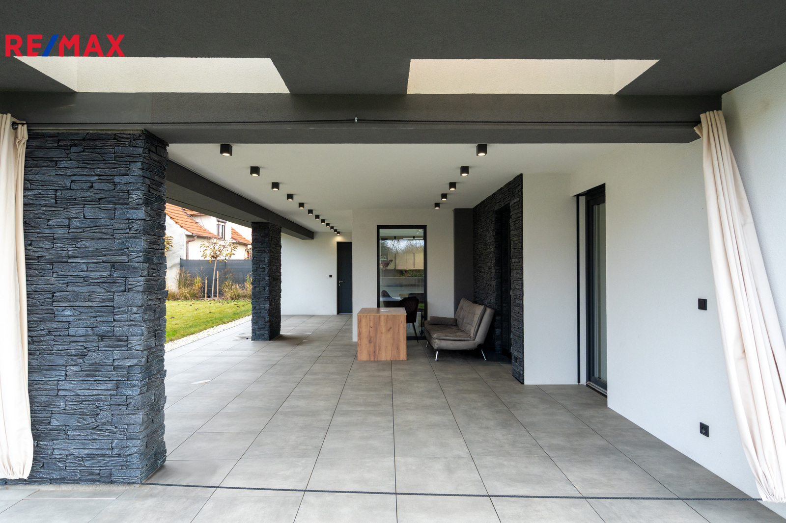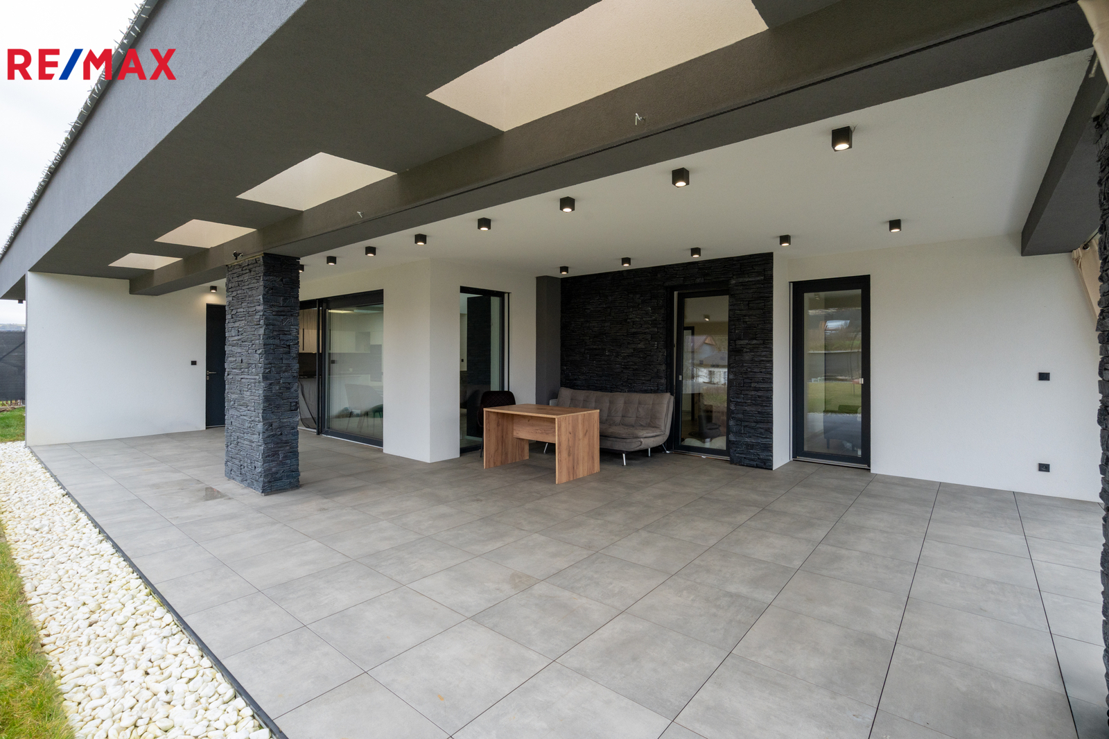 Dominantou domu je impozantní, vzdušný obývací pokoj s vysokými stropy, který vás okouzlí už při vstupu. Je dokonale propojený s designovou kuchyní na míru, vyrobenou kvalitním stolařem. Odtud máte přímý vstup na opravdu obrovskou terasu, ideální pro rodinné chvíle, grilování nebo ranní kávu s výhledem do zeleně. Terasa plynule navazuje na zahradu – perfektní místo pro děti, relax i soukromí.