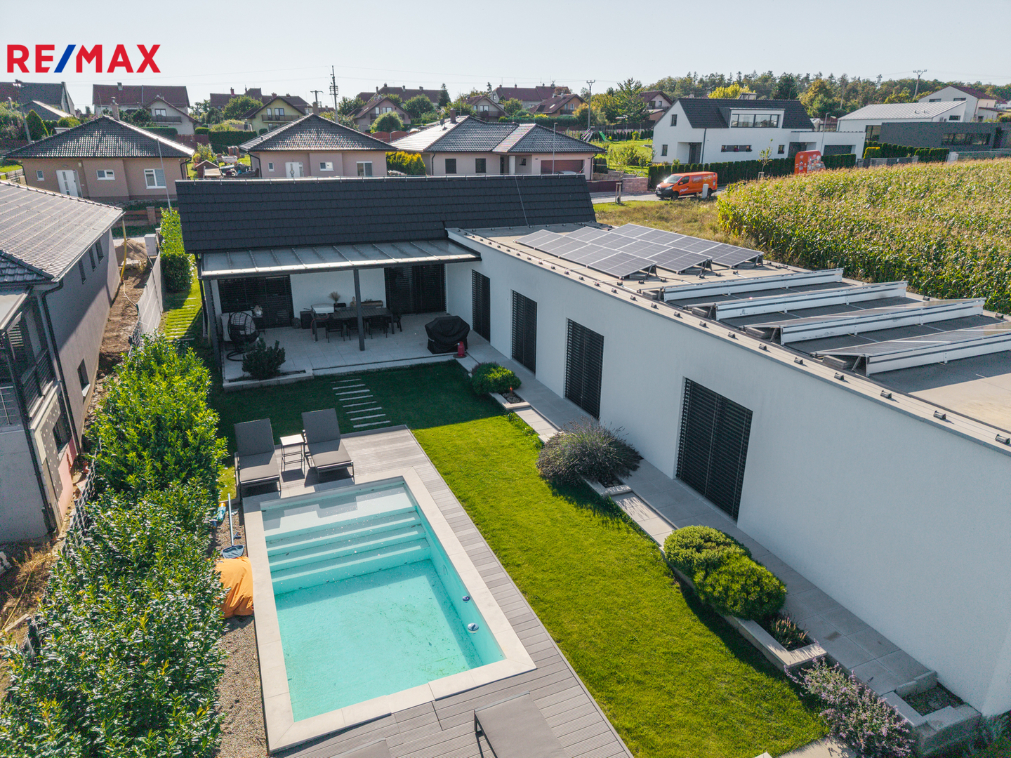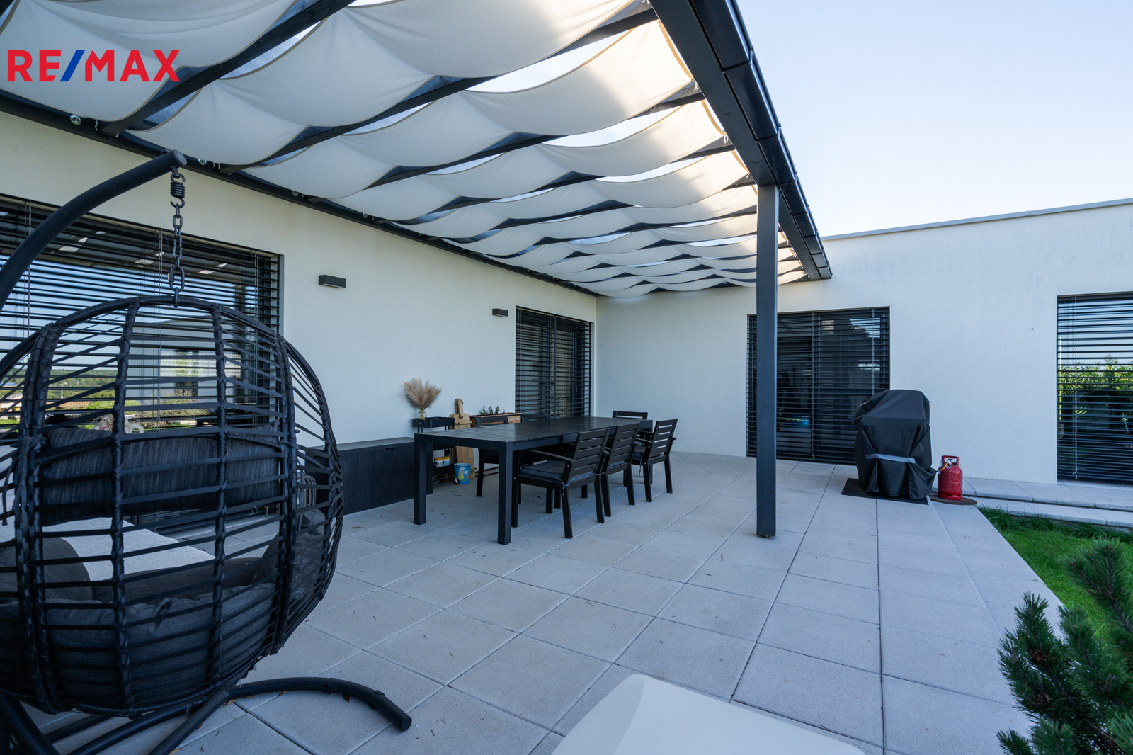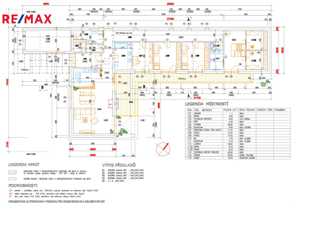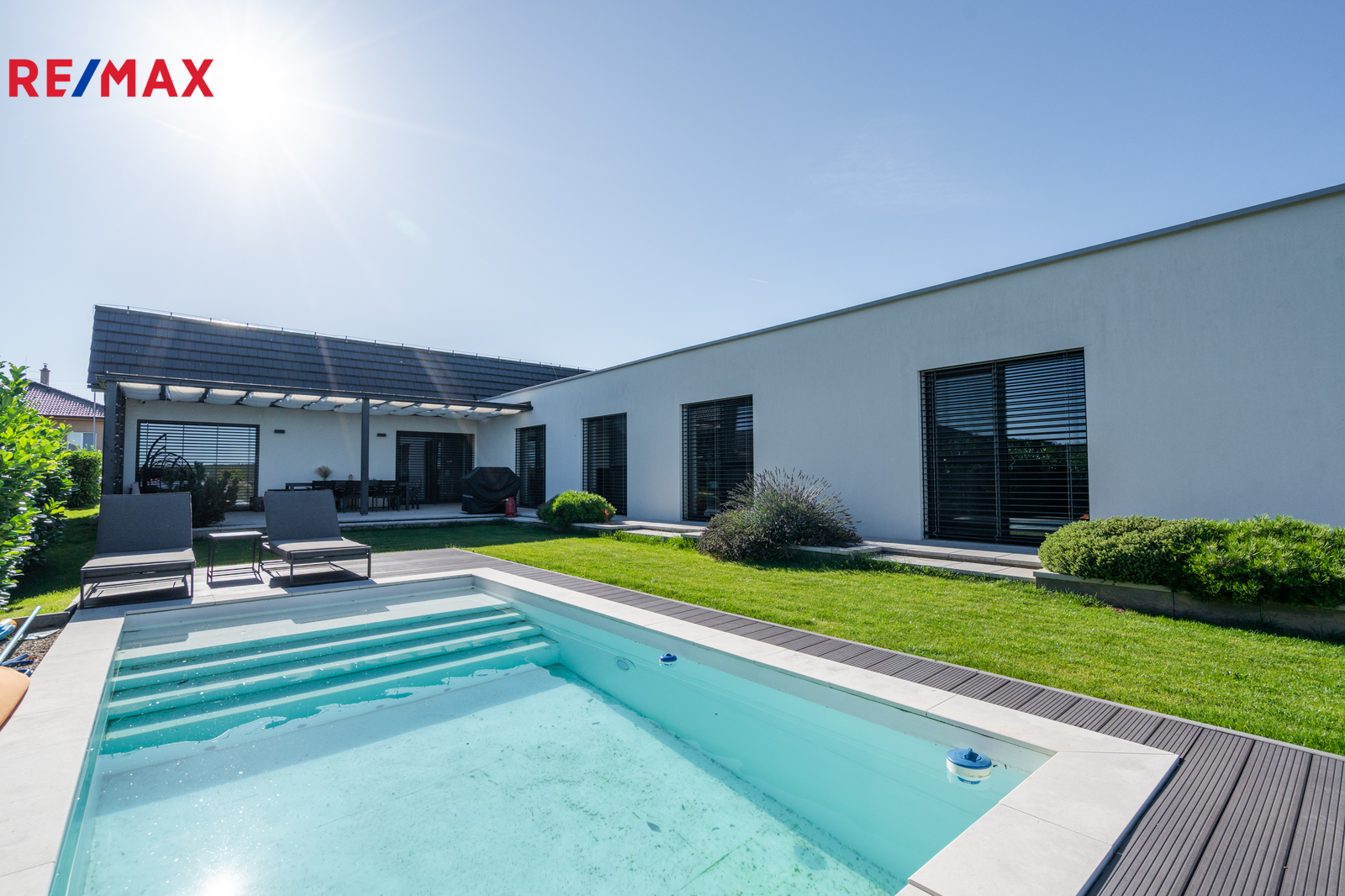 Dominantou domu je světlý obývací pokoj s kuchyní a jídelnou, odkud vedou velkoformátové posuvné dveře na krytou terasu. K dispozici jsou čtyři samostatné pokoje, dvě koupelny (jedna en-suite u ložnice), dvě toalety, dvě šatny u ložnice a další u vstupu, komora, technická místnost a garáž. Na pozemku jsou navíc tři parkovací místa a velký půdní prostor (cca 100 m²) pro úložné potřeby. Součástí domu je zastřešená pergola s terasou 50 m², ideální pro rodinné posezení.