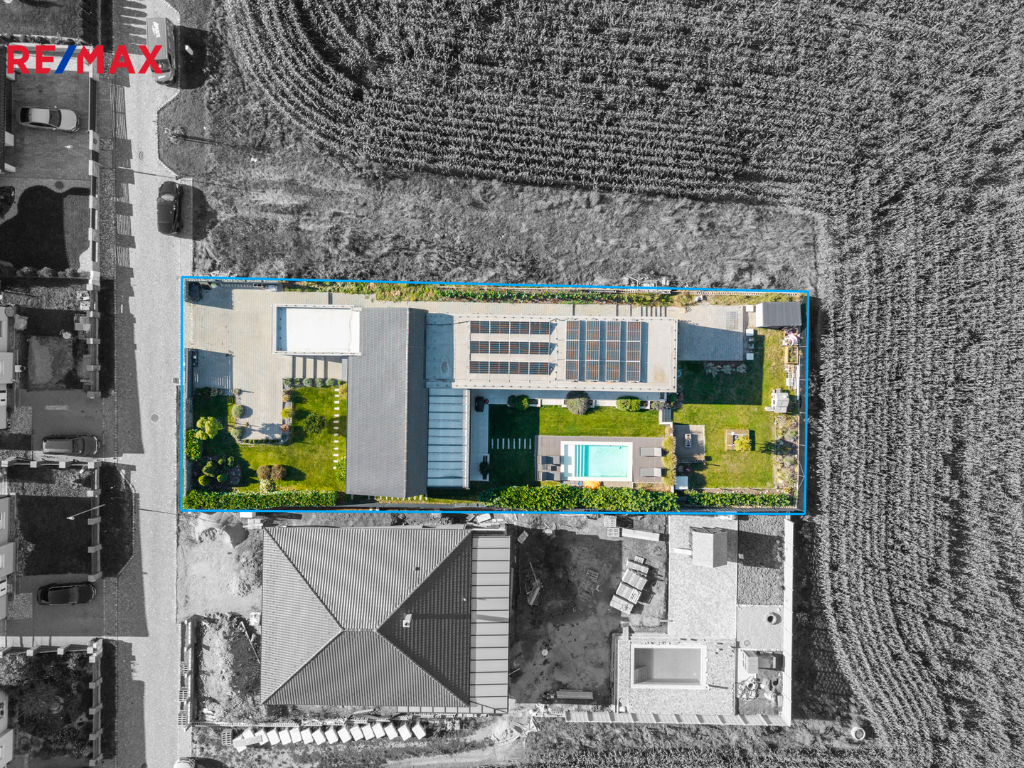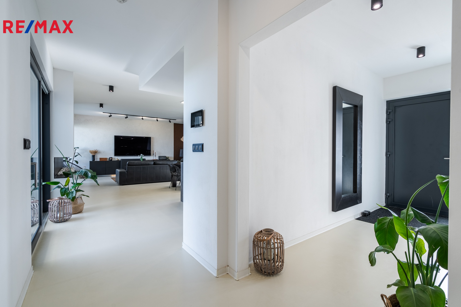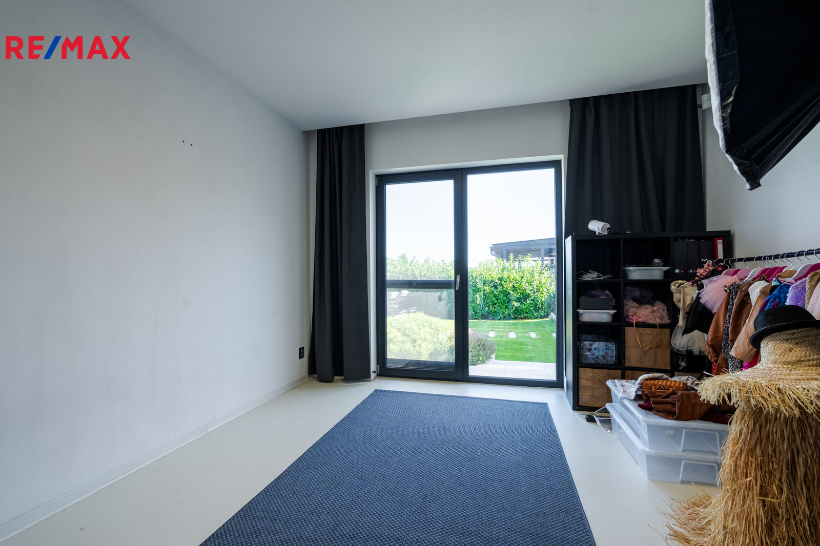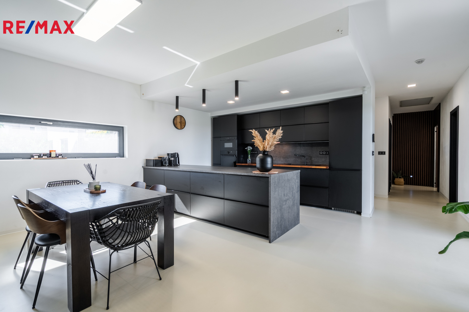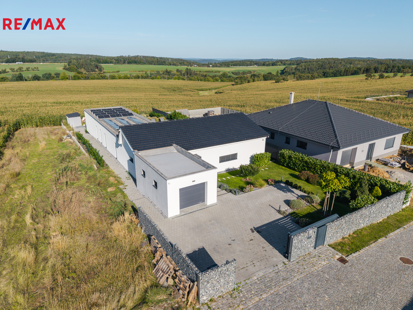 Dominantou domu je světlý obývací pokoj s kuchyní a jídelnou, odkud vedou velkoformátové posuvné dveře na krytou terasu. K dispozici jsou čtyři samostatné pokoje, dvě koupelny (jedna en-suite u ložnice), dvě toalety, dvě šatny u ložnice a další u vstupu, komora, technická místnost a garáž. Na pozemku jsou navíc tři parkovací místa a velký půdní prostor (cca 100 m²) pro úložné potřeby. Součástí domu je zastřešená pergola s terasou 50 m², ideální pro rodinné posezení.