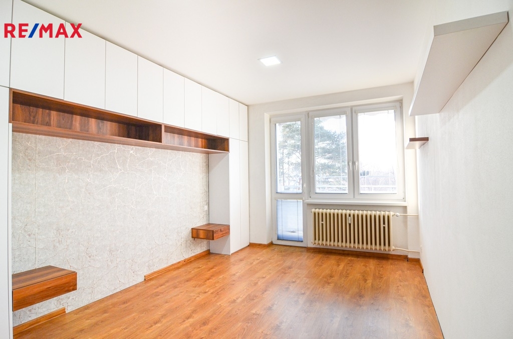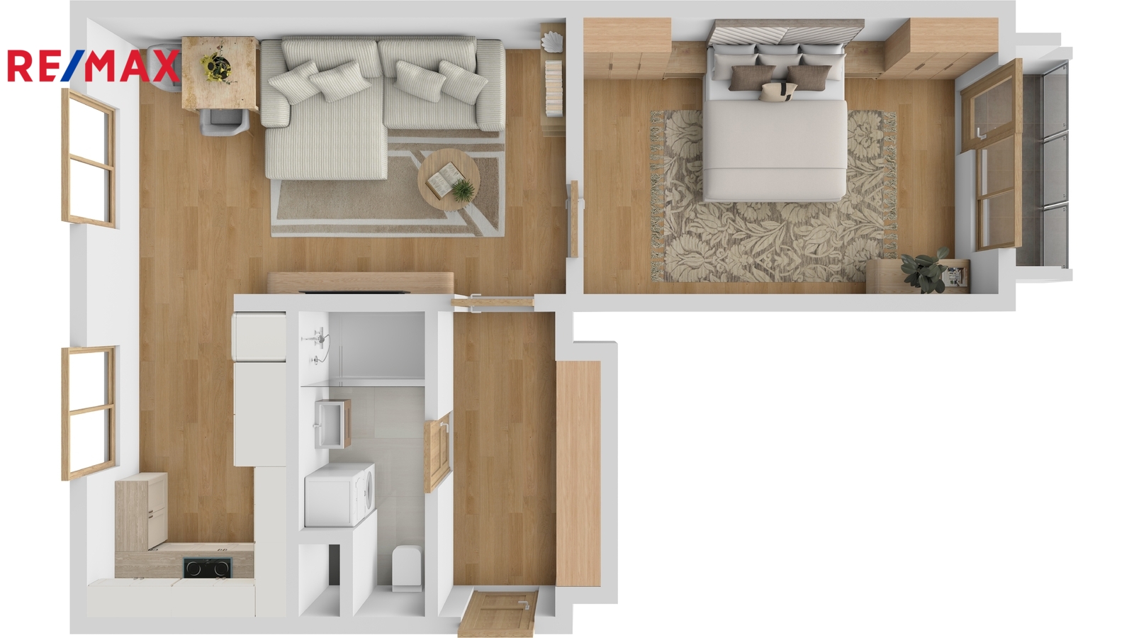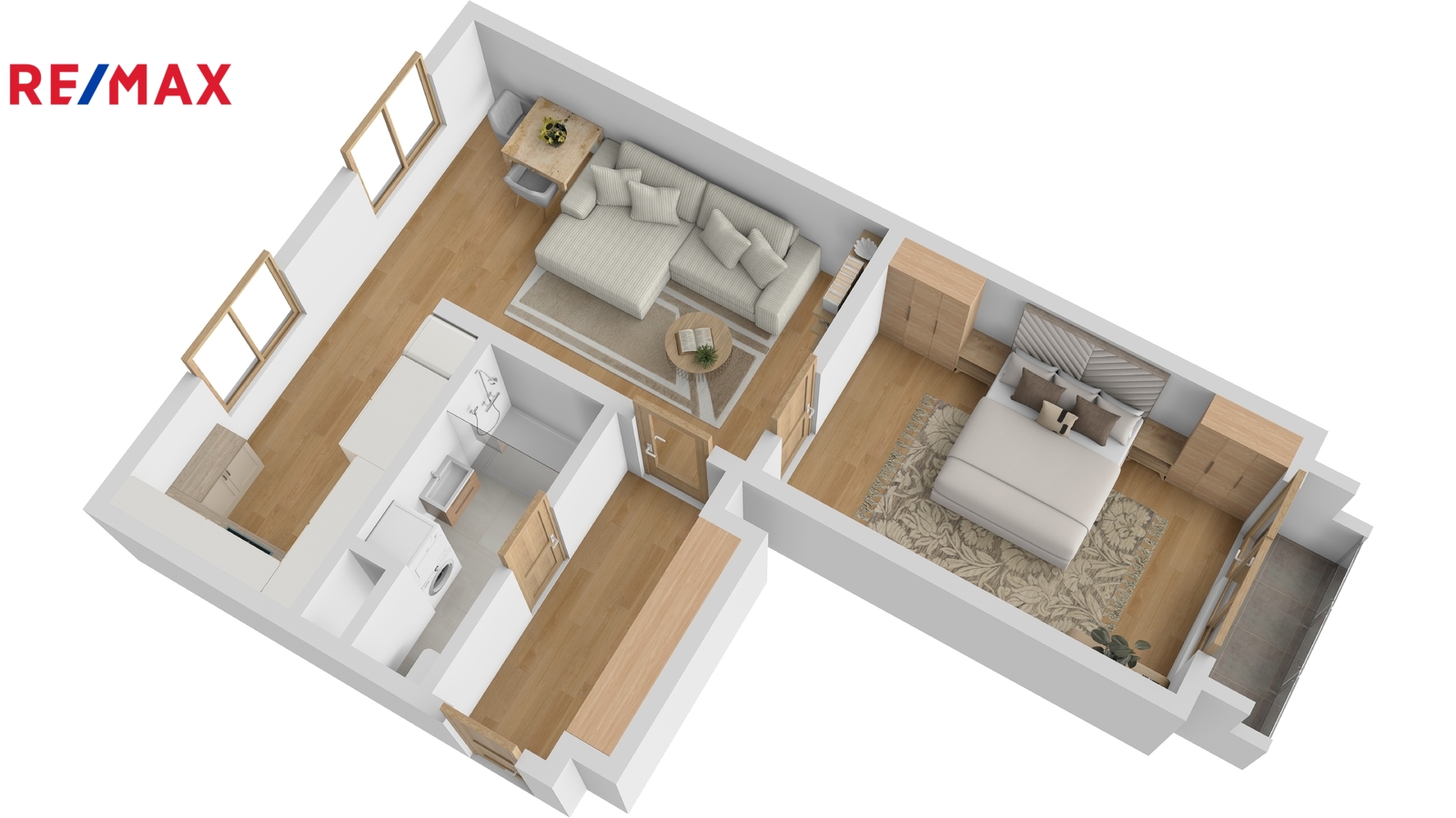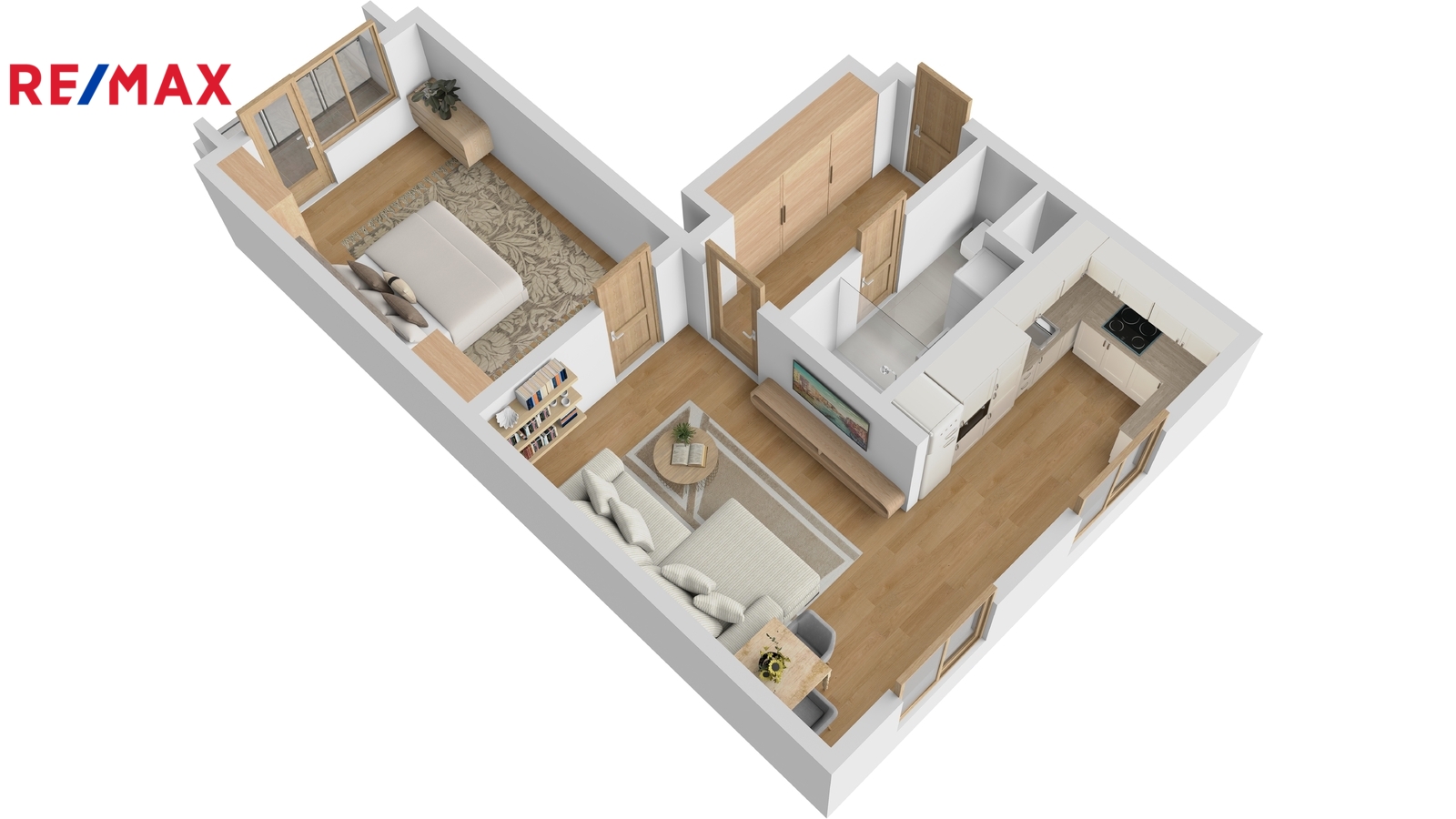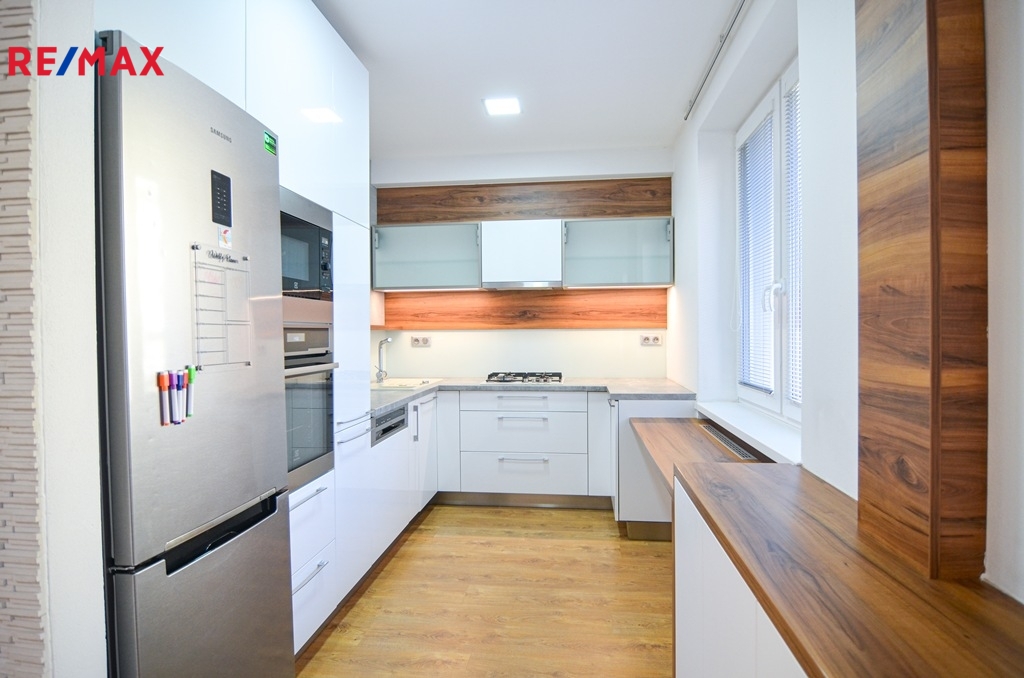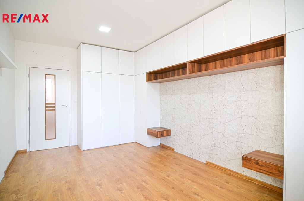 Dominantou bytu je obývací pokoj propojený s kuchyňským koutem, který nabízí dostatek pracovní plochy, vestavěné spotřebiče a vkusné provedení v kombinaci bílých a dřevěných prvků. Ložnice se vstupem na balkon s výhledem do klidné zeleně navazuje na styl celého bytu – čisté linie, vestavěné skříně na míru až ke stropu a decentní barevné ladění. Díky tomu působí prostor harmonicky a zároveň prakticky.