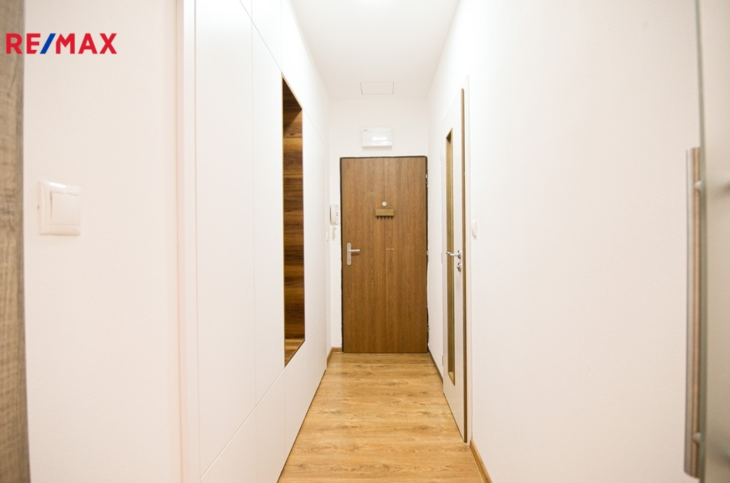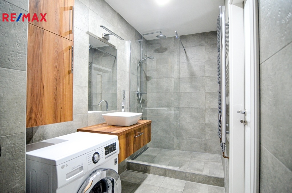 Po vstupu do bytu vás přivítá chodba s velkou vestavěnou skříní na míru, která poskytuje dostatek úložného prostoru. Koupelna společná s toaletou je laděna do elegantních šedých tónů a vybavena sprchovým koutem, umyvadlem a místem pro pračku i sušičku.