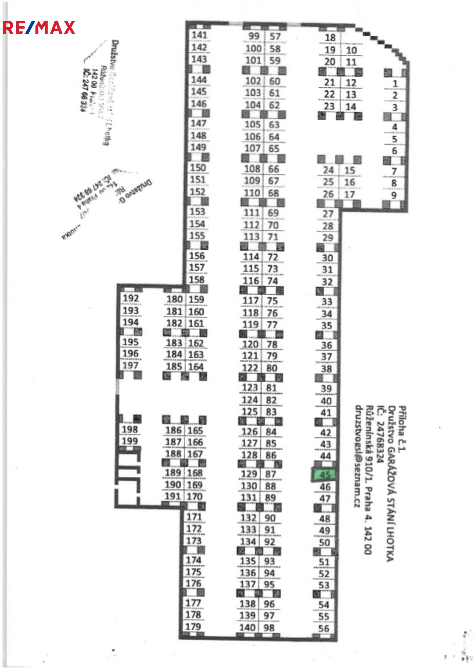Garážový objekt se nachází v klidné rezidenční části Lhotky a disponuje třemi samostatnými vjezdy, což zajišťuje pohodlný a rychlý příjezd. Vjezd je řešen elektrickými vraty s ovládáním přes mobilní telefon. Objekt je ve správě družstva, pravidelně udržovaný a ve velmi dobrém technickém stavu.