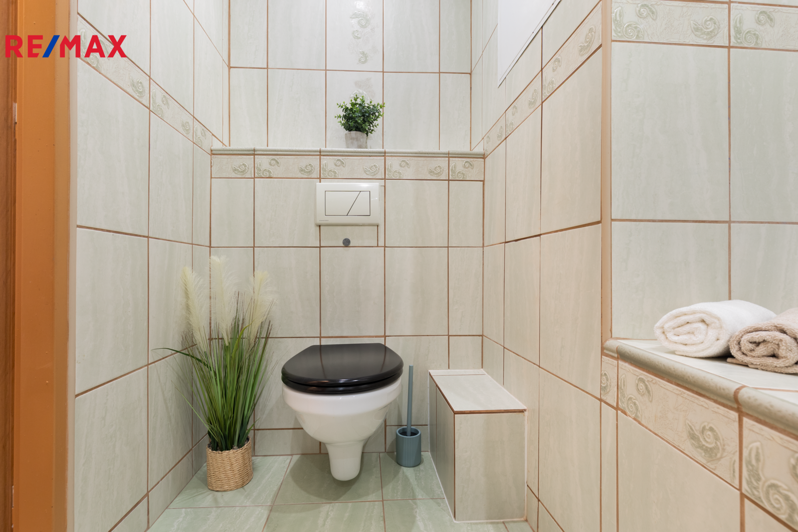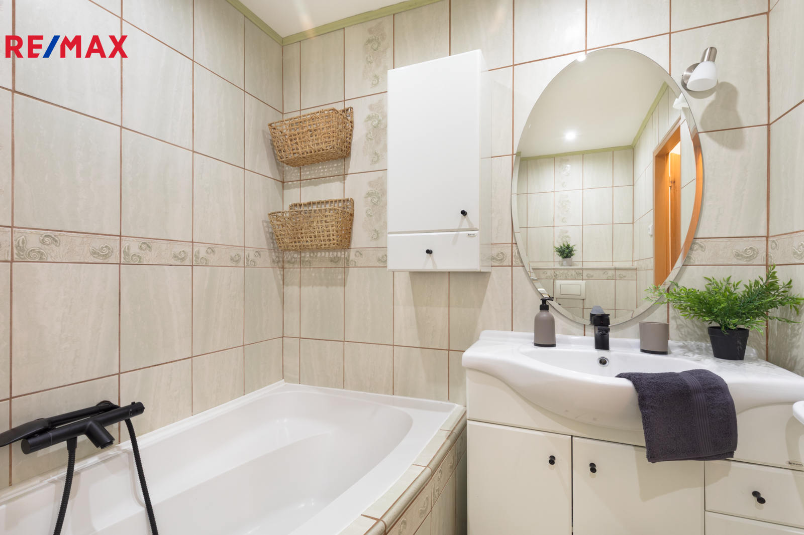 ✅ Koupelna zděná, béžové obklady, podélná vana, umývadlová skříňka, nové černé baterie, ve vaně termostatická baterie