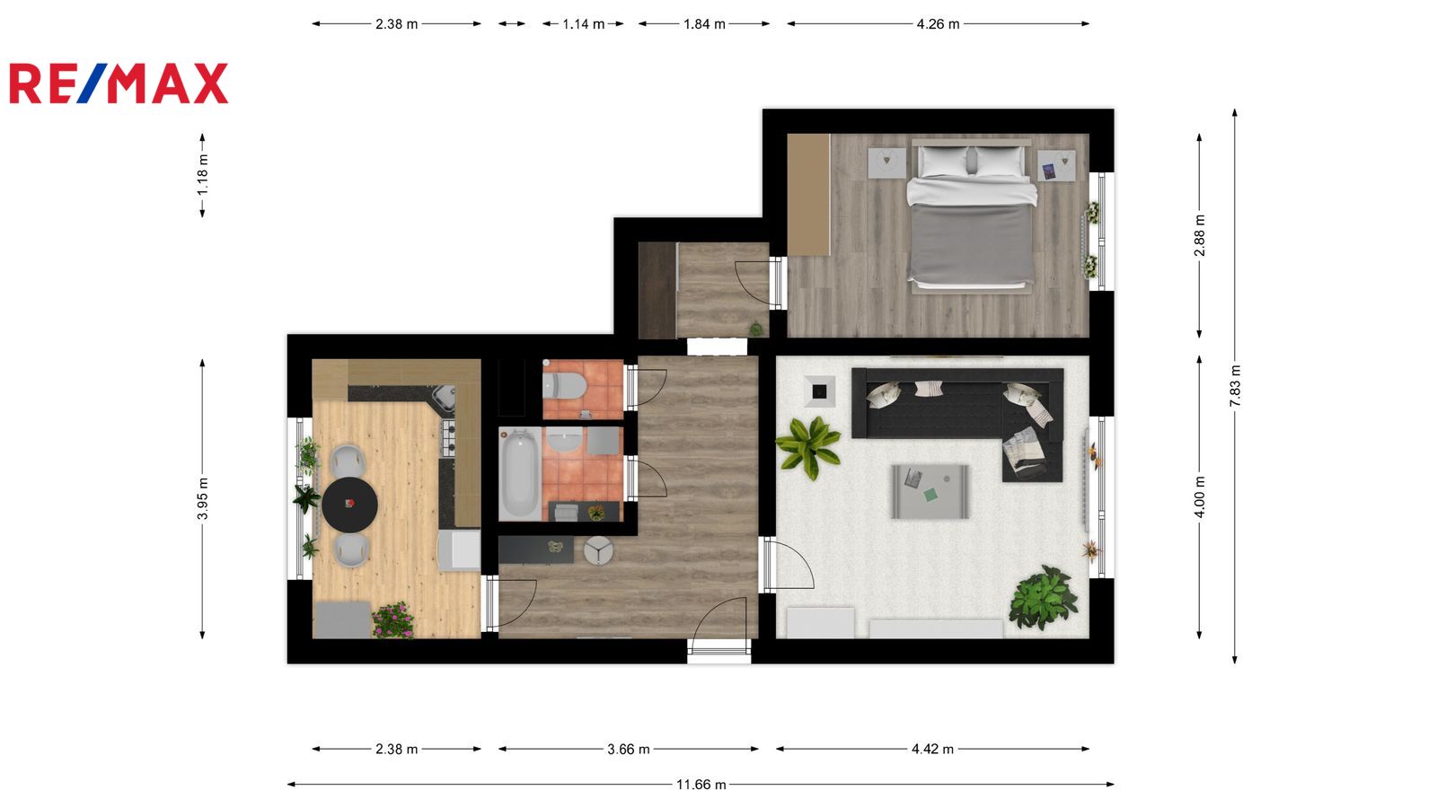 Interiér bytu je moderní a světlý. Obývací pokoj a ložnice jsou orientovány na jih, kuchyň pak na severozápad. Byt disponuje také koupelnou s vanou, samostatným WC a prostornou chodbou. K bytu náleží sklepní koje v suterénu.