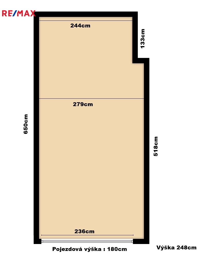 Vnitřní plocha 17,5m2 , vnitřní rozměry viz plánek cca 280x650cm, výška 248cm, průjezd vrata šířka 236cm a výška 180cm.