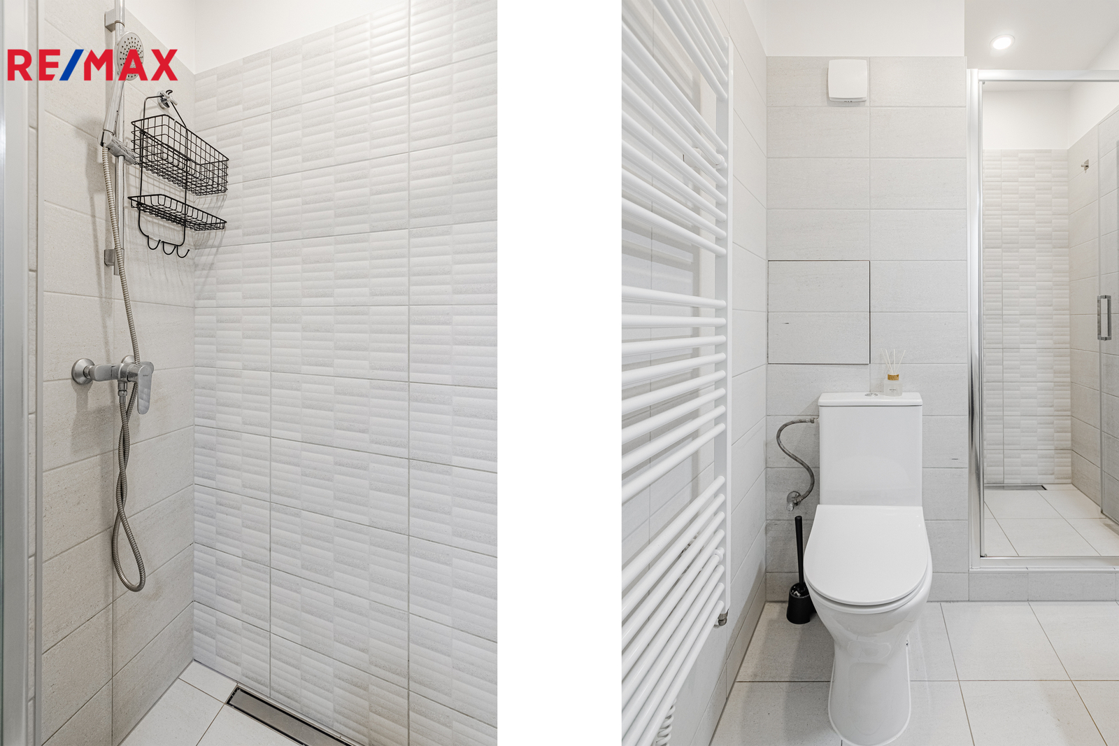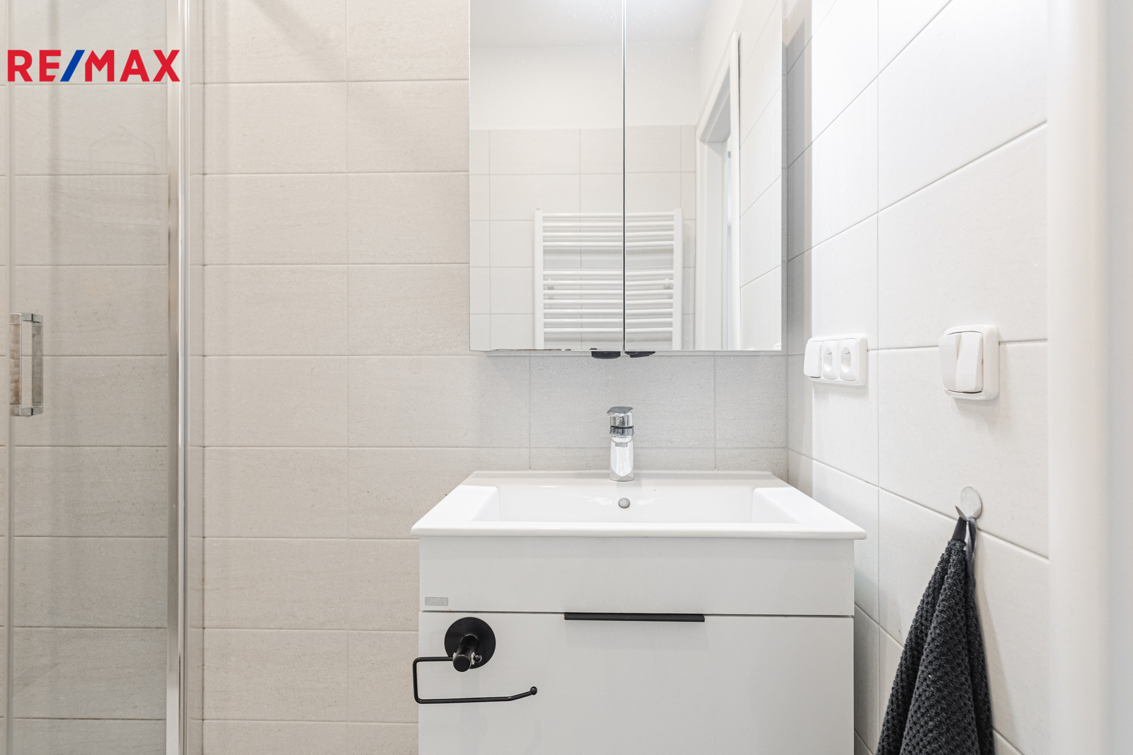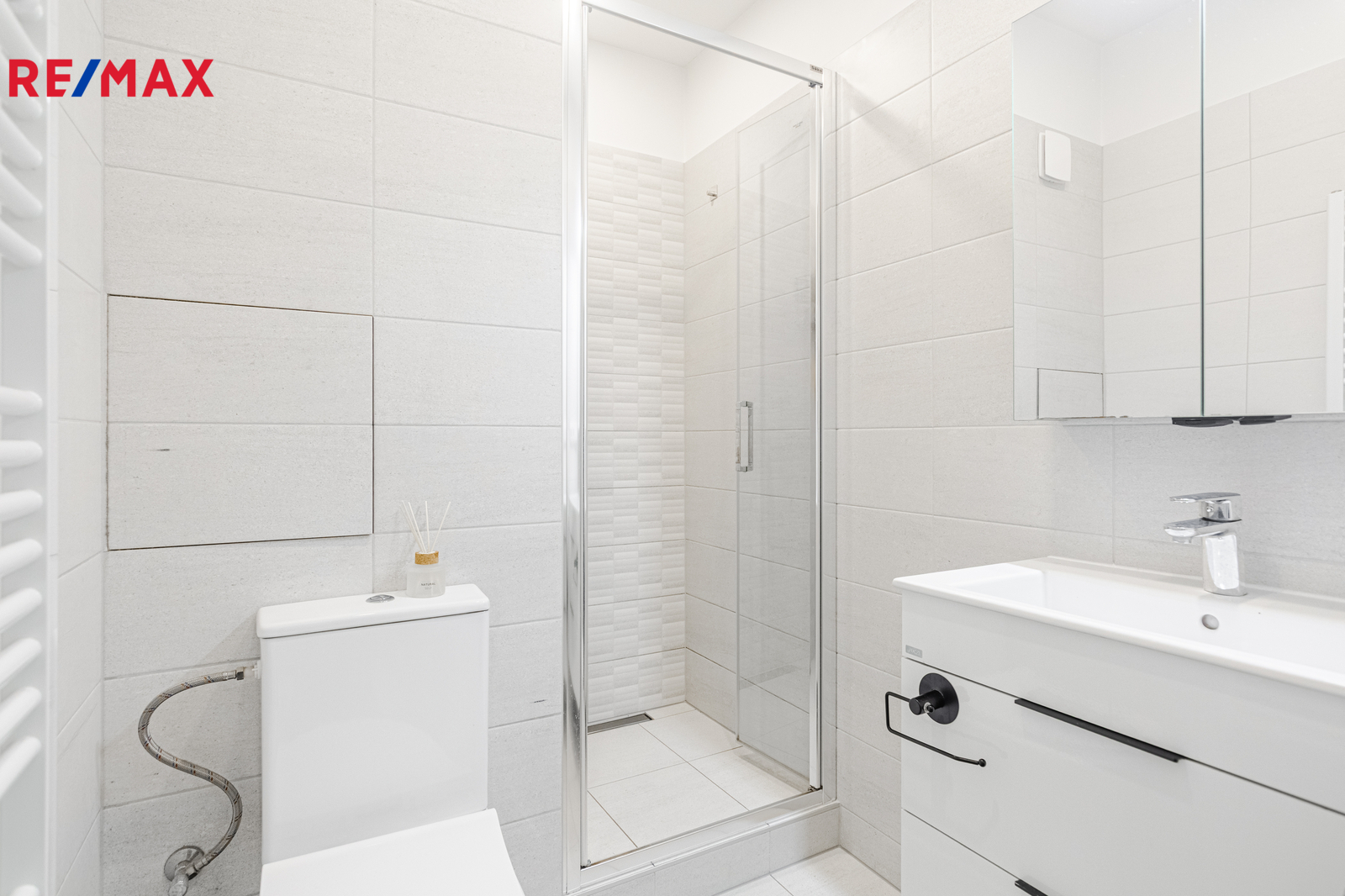 Koupelna je vybavena sprchovým koutem se skleněnou zástěnou, umyvadlem se skříňkou, zrcadlovou skříňkou a toaletou. Komfort zvyšuje topný žebřík.