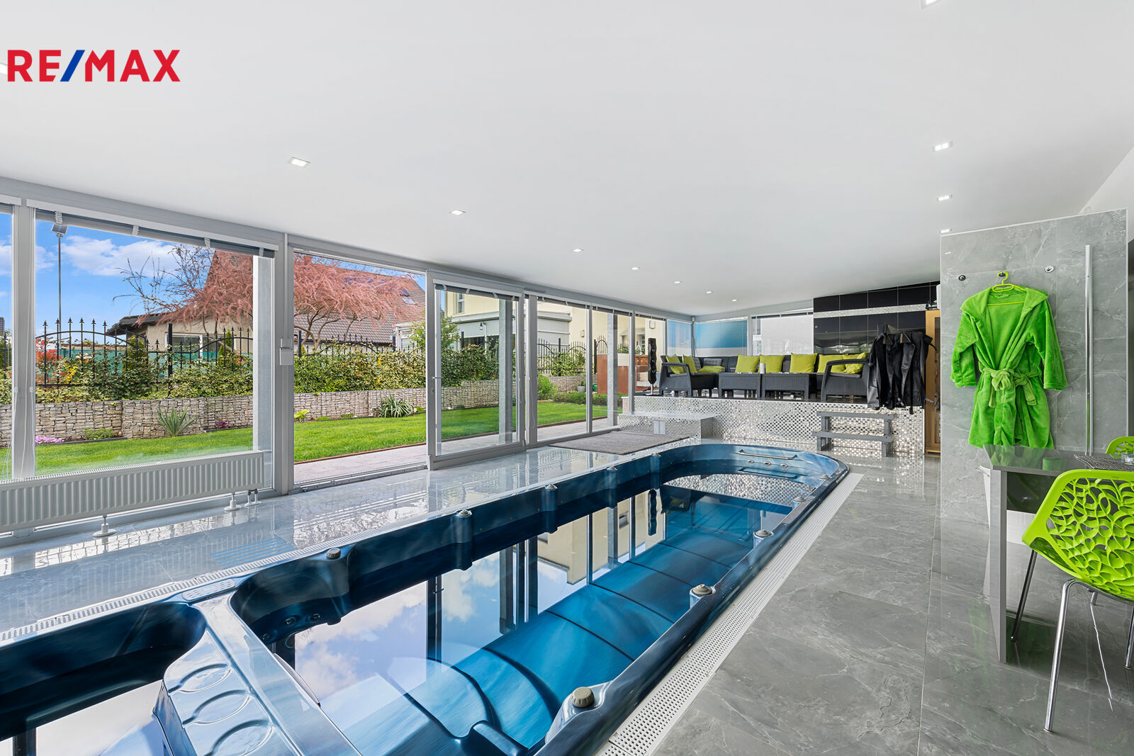 Na zahradě se nachází samostatná budova s vlastním wellness, kde kromě sauny, vířivky až pro 6 osob, je i bazén s protiproudem, prostor pro cvičení a relaxaci, menší kuchyň, šatna a veškeré sociální zázemí. Stejně jako v domě, i zde je díky materiálovému provedení a prosklení ze tří stran světlost a moderní vzhled. Rekuperační jednotka zajišťuje řízené větrání v hlavním prostoru.