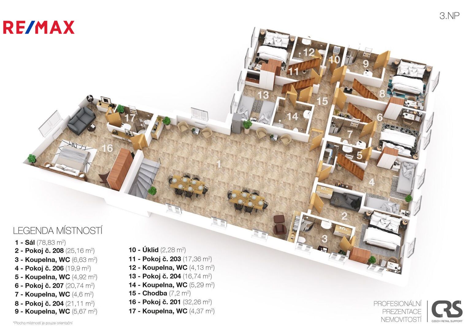 3.patro: luxusní pokoj s baroktním nábytkem, vanou a výhledem do údolí Sazávy. 4x mezonet (1x pro invalidy) 4-5 lůžkový, dvoulůžkový s trezorem na zbraně - ostatní s trezory na peníze, cennosti.
