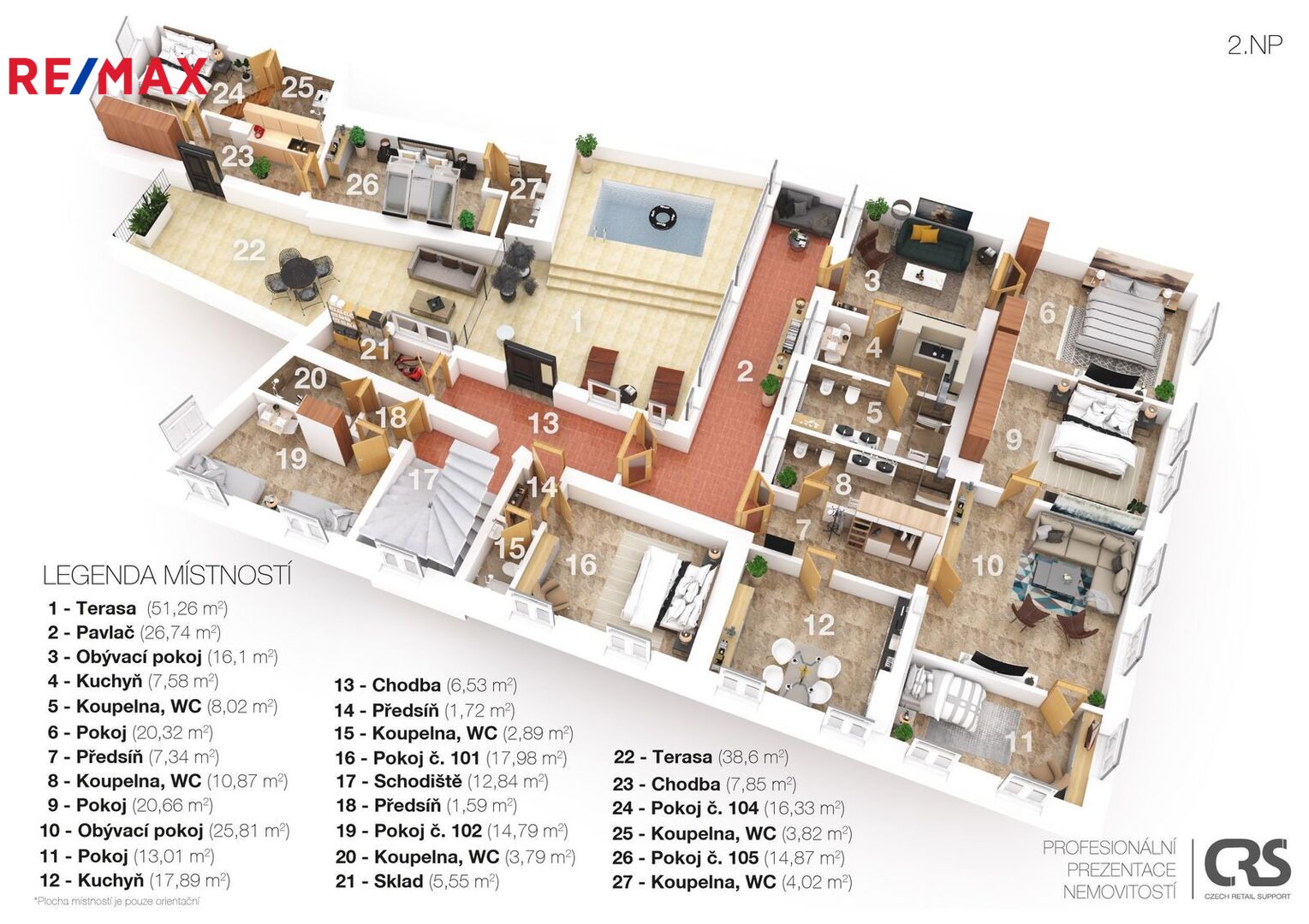2.patro: byt 3+1, byt 2+1. Obývací pavlač, terasa s bazénem a sklad pro čisté prádlo a dva dvoulůžkové pokoje.