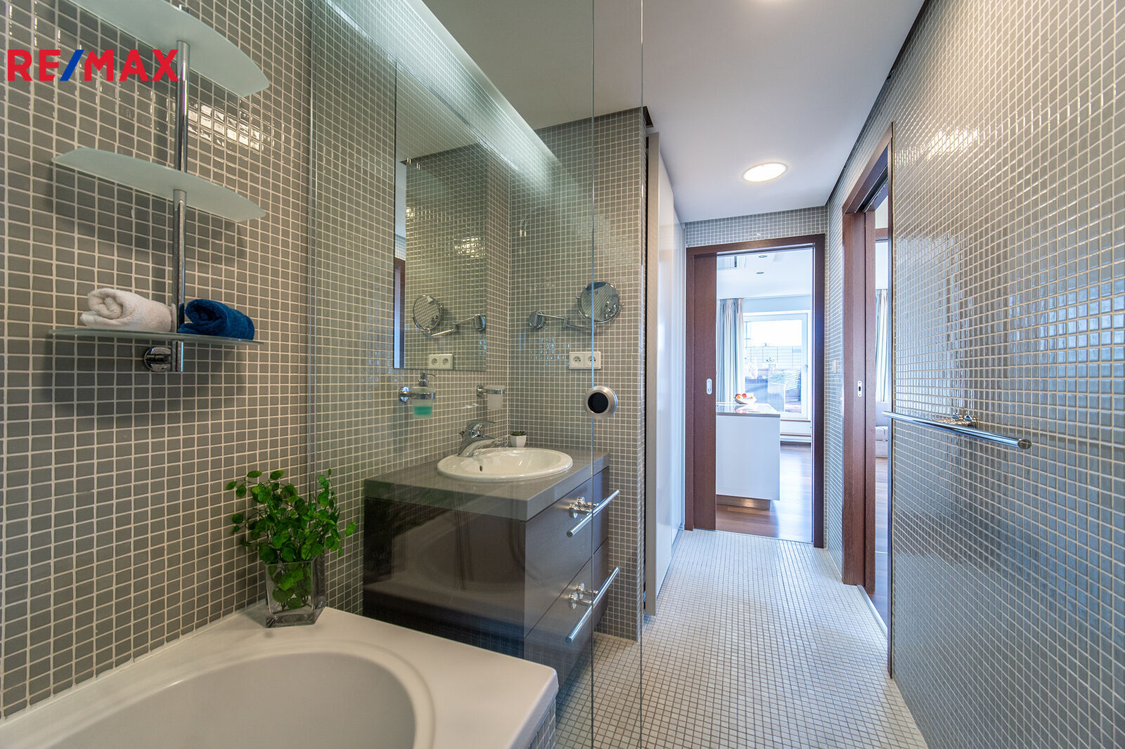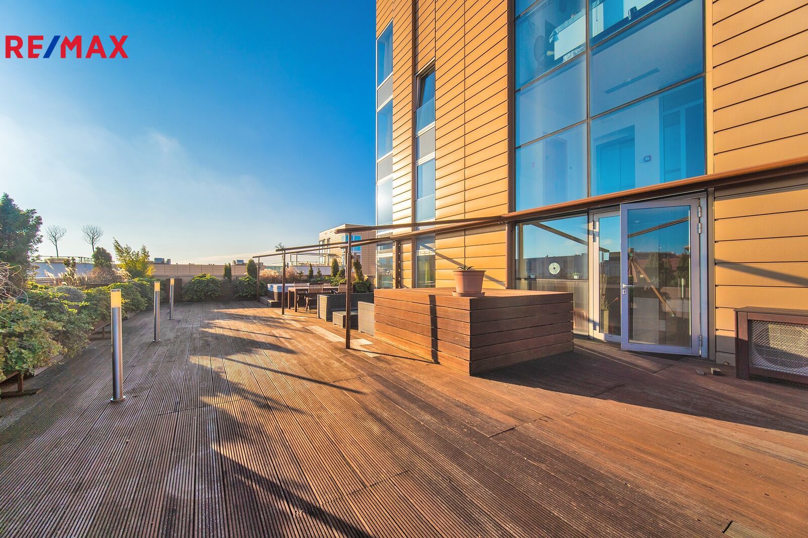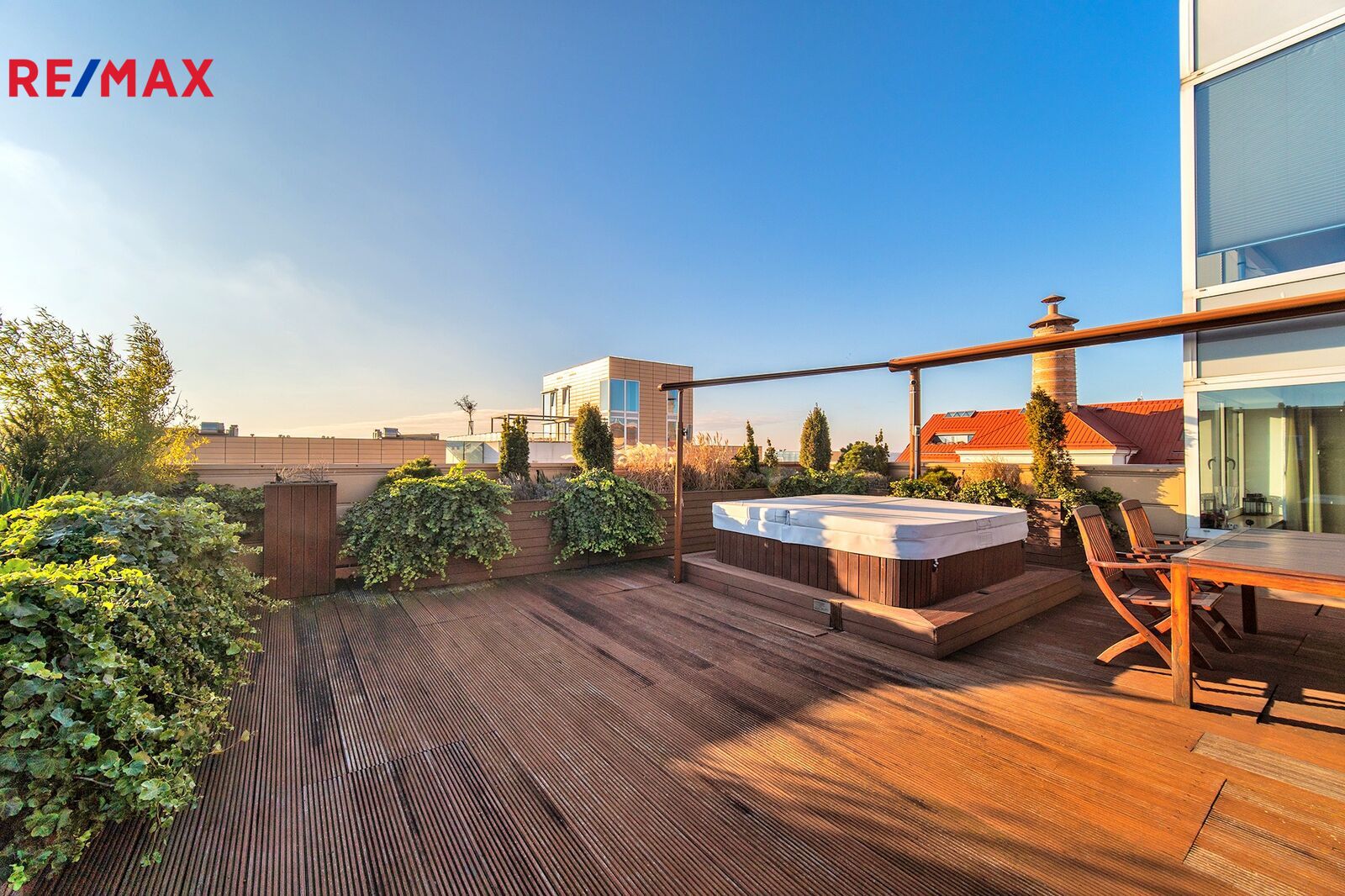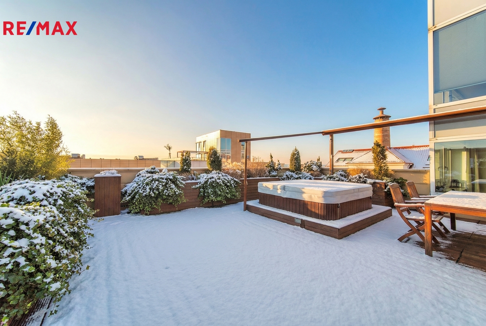 Rozlehlá terasa o velikosti 189 m² je osazena vzrostlými rostlinami a keři, které vytvářejí klidnou přírodní atmosféru. Automatický zavlažovací systém se stará o bezproblémovou péči o zeleň. Díky poloze uvnitř areálu zde panuje klid a pohoda bez hluku z okolních ulic. Celá plocha terasy je z tropického dřeva. Na terase můžete posedět s rodinou nebo přáteli, užít si grilování nebo jen pohodový relax v luxusní výřivce. V horkých dnech se terasa zastíní automatickou pergolou.
