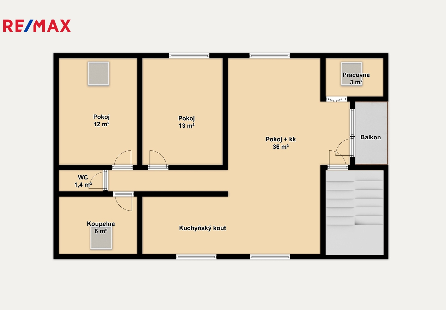 • Orientační celková výměra: cca 98 m² (75 m2 podlahová plocha + balkon + v suterénu vstupní hala)