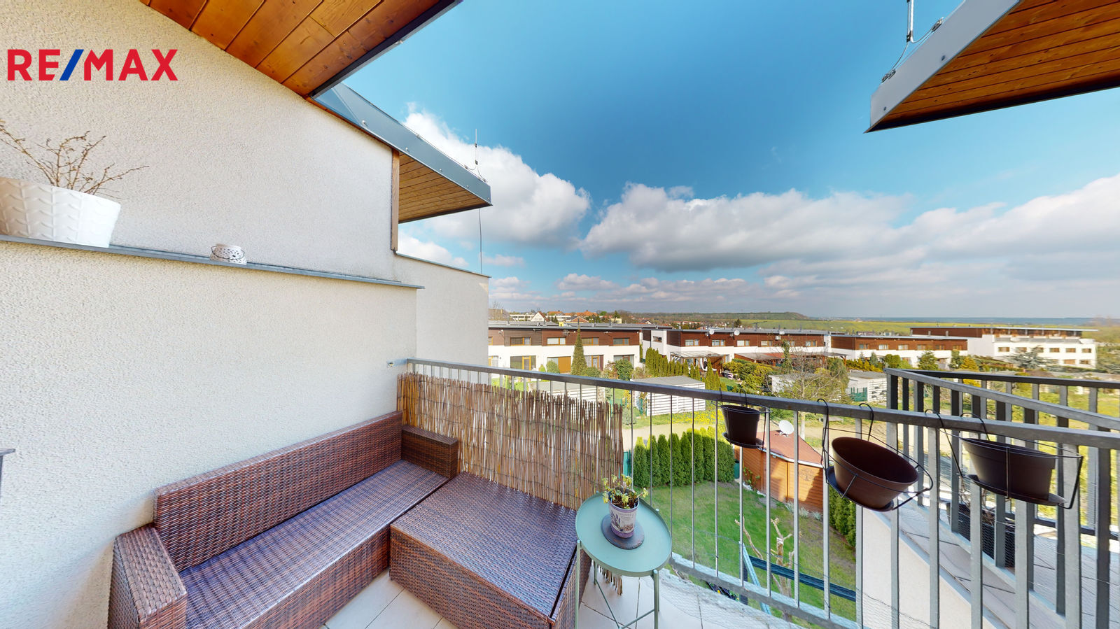 Vybavení bytu které je součástí: Kuchyňská linka s varnou deskou, digestoří, dřezem, myčkou, lednicí. Další vybavení bytu: 2 x šatní skříň, knihovna v předsíni, jídelní stůl, židle, závěsné houpací křeslo na jedné z teras, sedací nábytek na terase, patrová police v koupelně, Dle požadavku zájemce možno i prázdné kromě kuchyňské linky a jídelního stolu.