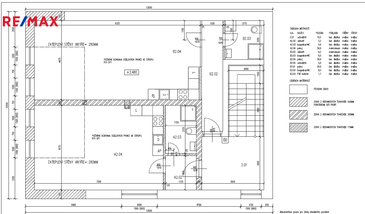 Zastavěná plocha 10,5*13,5 + 1,3*7,8+1,3*2,8= 156 m2. Celková užitná plocha je 286,3 m2.