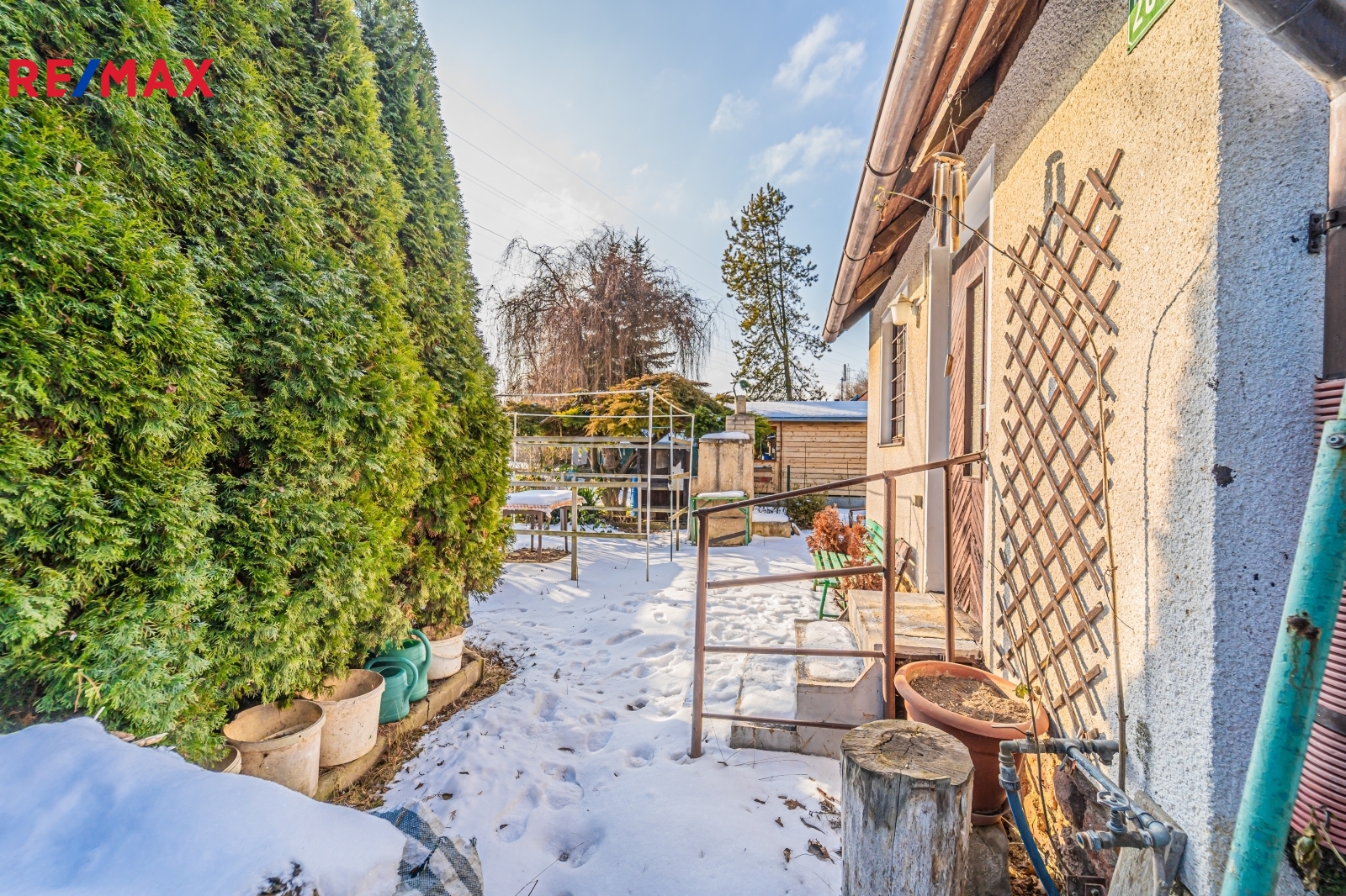 Chata stojí na vlastním pozemku a má přidělené číslo evidenční. K chatě náleží i zahrada, která je z větší části v osobním vlastnictví (celkem 224m²) a z části v majetku Římskokatolické farnosti Slaný (p.č.1474/11 o ploše 146m²) - užívání této části je ošetřeno podnájemní smlouvu přes zahrádkářský svaz za symbolický roční poplatek. Nemovitost byla doposud využívaná a dobře udržovaná.