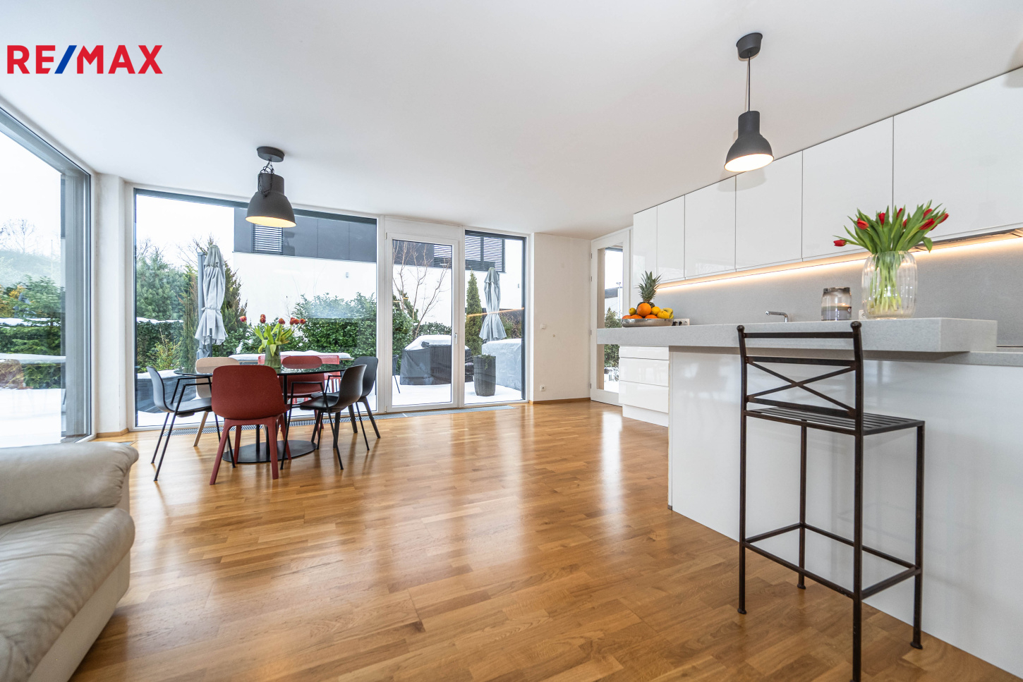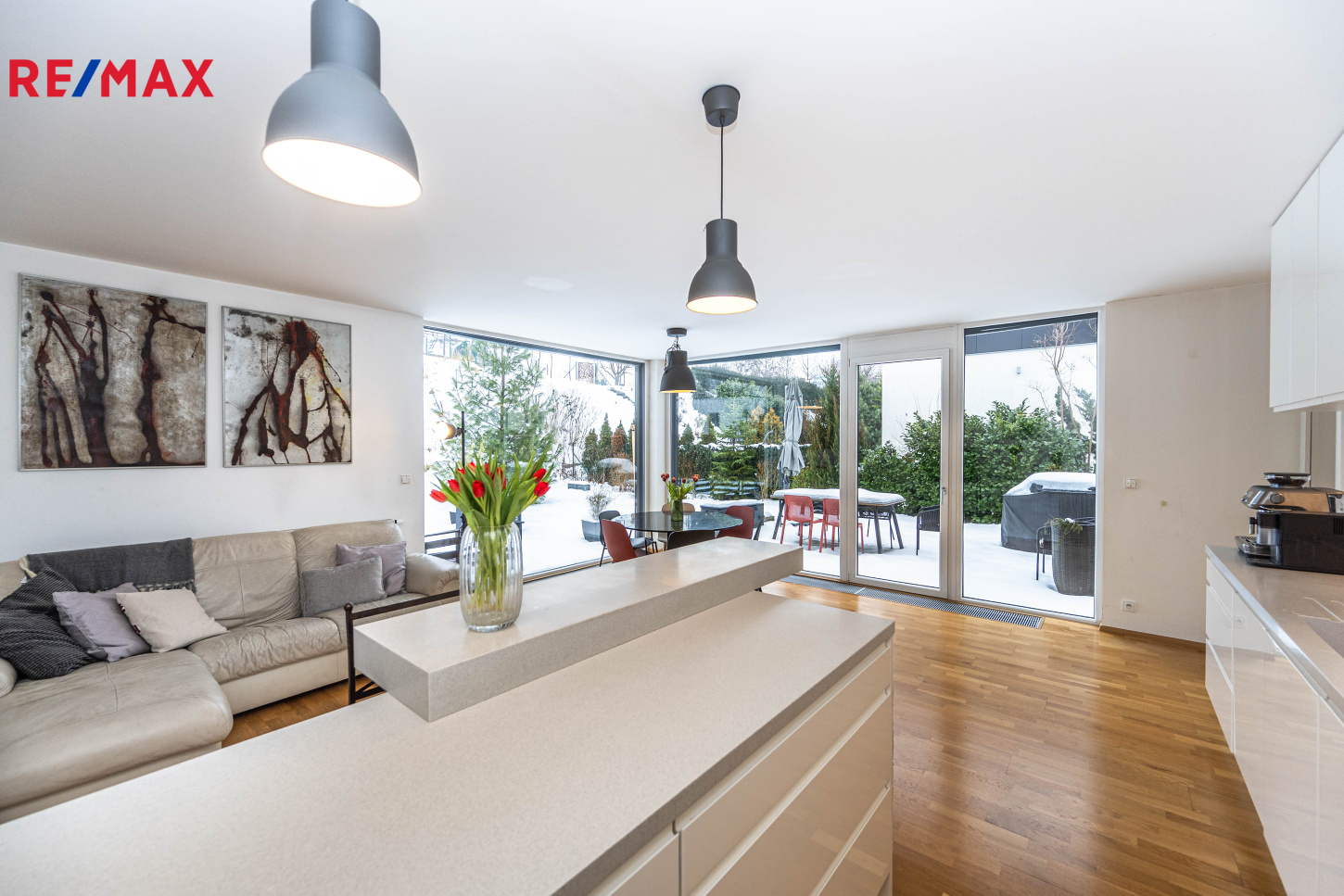 Dominantou domu je prostorný obývací pokoj (36 m2) s velkoformátovými okny a přímým vstupem na terasu a zahradu, který nabízí ničím nerušený výhled do zeleně a ideální prostor jak pro rodinný život, tak pro čas s přáteli.