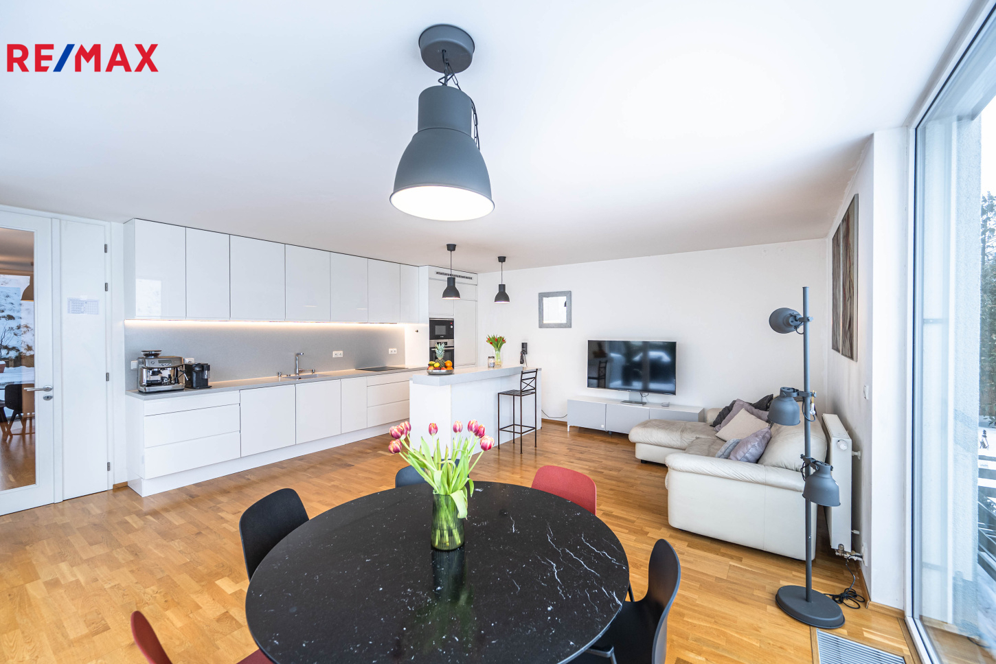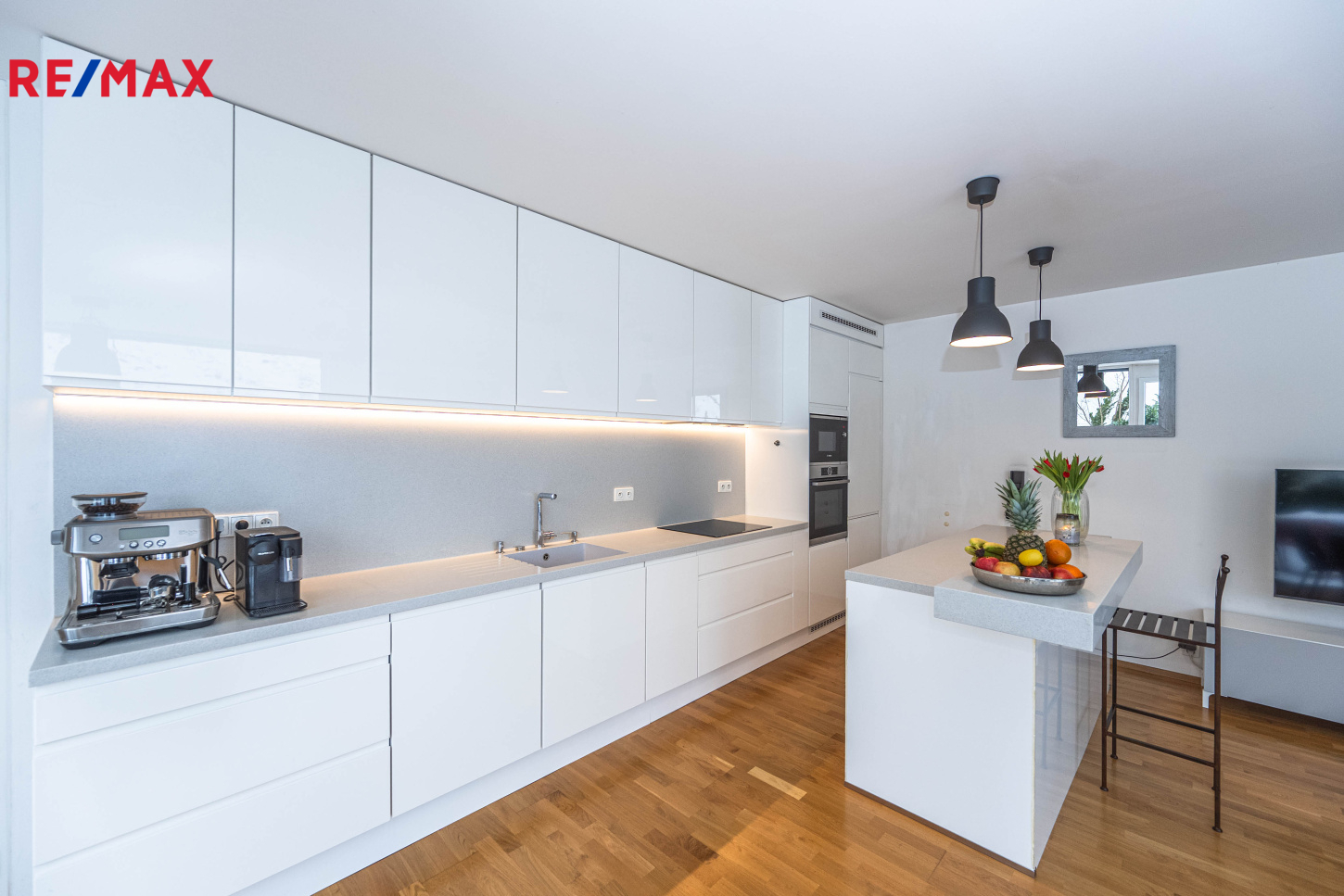 Součástí obývacího pokoje je kompletně vybavená kuchyňská linka (Livanza) s kvalitními spotřebiči (Siemens/ Bosh) a s praktickým ostrůvkem, prostor je krásně světlý a slunný celý den.