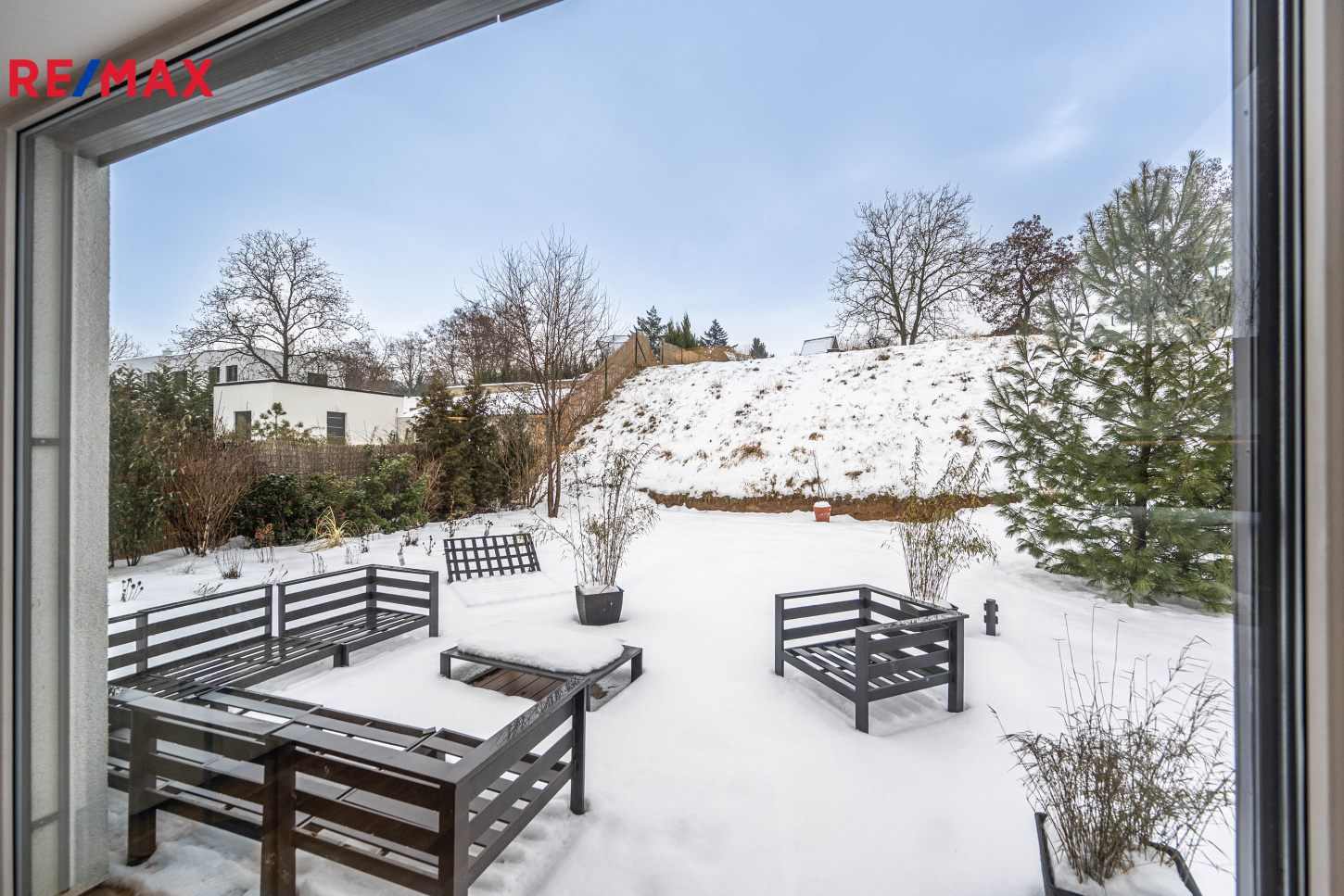 K domu náleží dvě terasy, zařízeny jsou moderním venkovním nábytkem a stíněním. Zahrada se vzrostlou zelení je téměř bezúdržbová, k dispozici je také sezónní bazén a moderní gril.