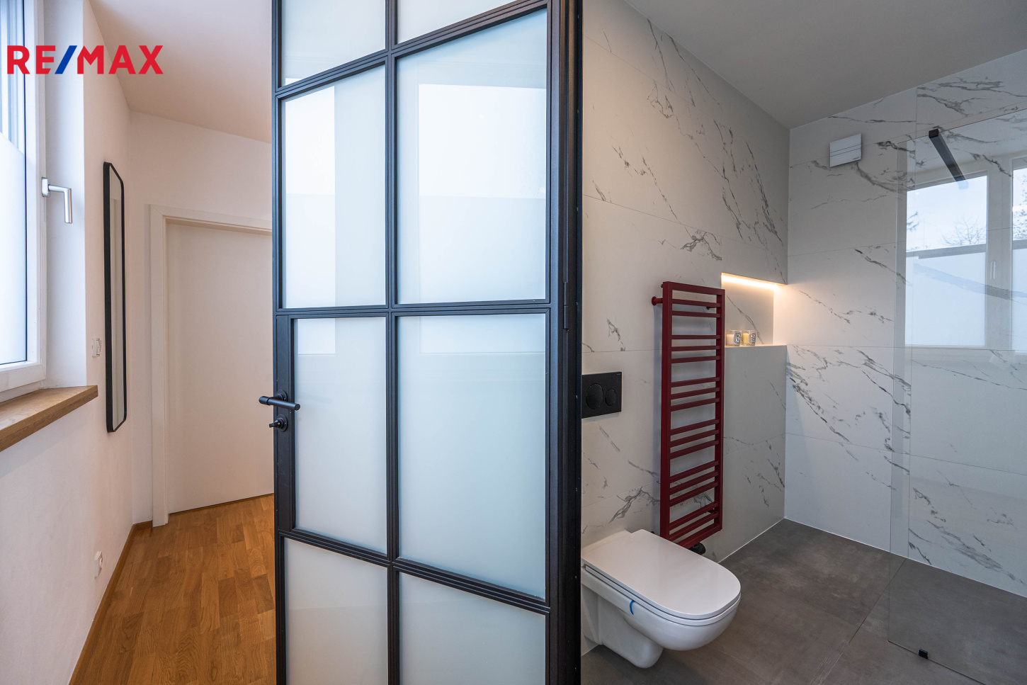 Nemovitost disponuje třemi designovými koupelnami, které jsou zařízeny nadstandardními zařizovacími prvky (HansGrohe, Laufen).