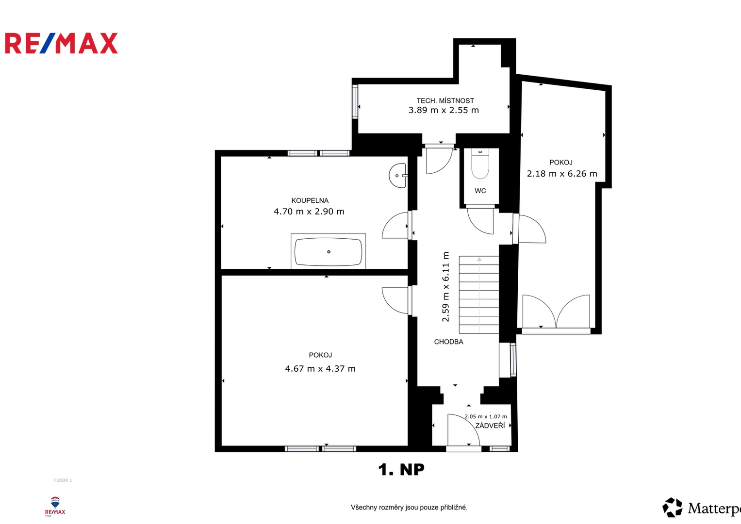 V 1. NP je umístěno zádveří/ předsíňka, pokoj, koupelna, samostatné WC, 2. pokoj/ zimní zahrada s francouzským oknem a vstupem na zpevněnou plochu/ terasu před domem a v zadní části technická místnost (úpravy nebyly dokončeny).