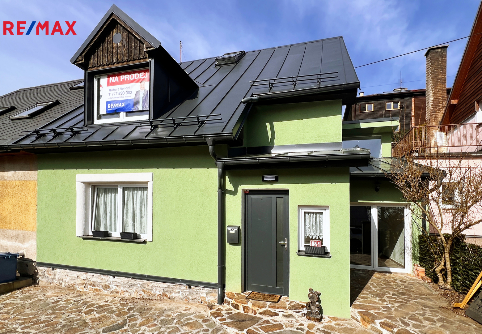 Velkou výhodou domu je nejen jeho situování na jih, ale i umístění v klidné části obce, kam zajíždějí jen místní obyvatelé.