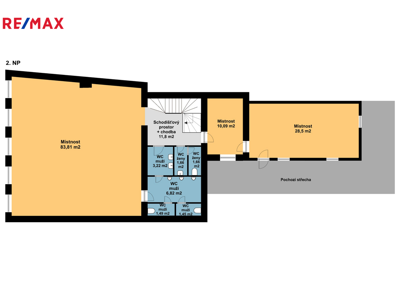 V přízemí o užitné ploše 203 m² se nachází otevřený prostor, dámské a pánské WC a menší sklad. První patro o ploše 150 m² nabízí dvě velké místnosti, spojovací prostor, dámské a pánské WC a vstup na střechu, kterou lze využít jako terasu. V podkroví o ploše 124 m² je k dispozici prostorná předsíň, tři samostatné místnosti, WC a malý sklad.
