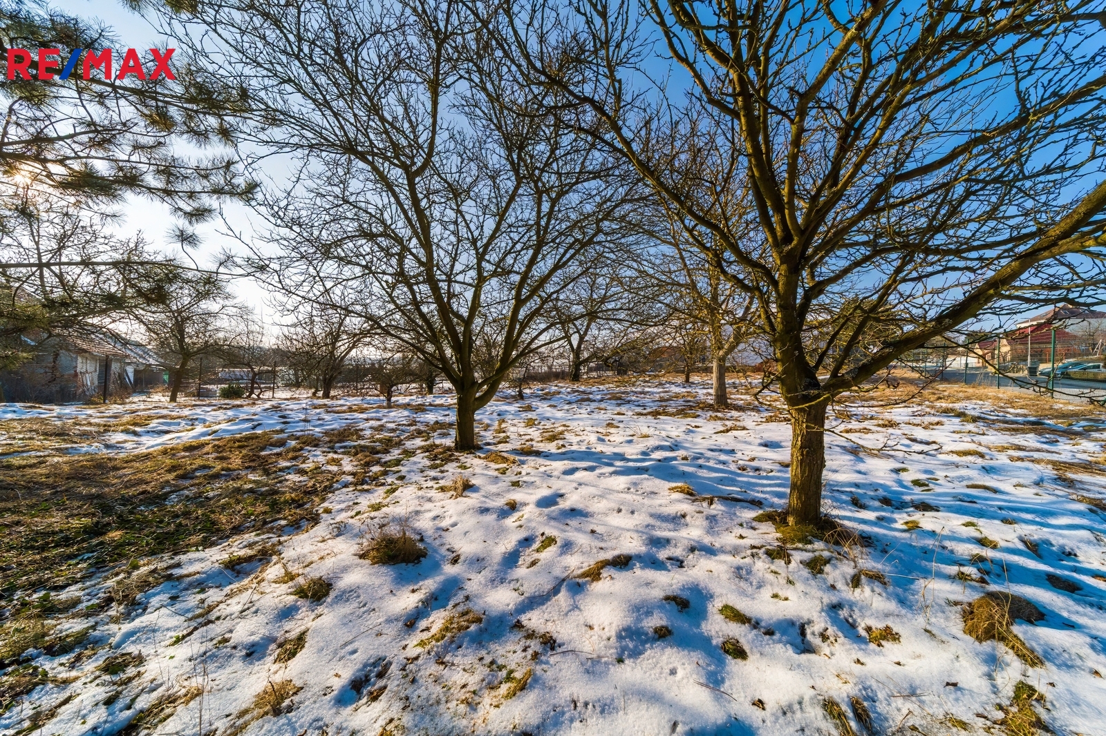 Na pozemku se nachází vzrostlé stromy, které mohou zůstat přirozenou součástí budoucí zahrady – nebo si prostor přizpůsobíte přesně podle vlastních představ.
