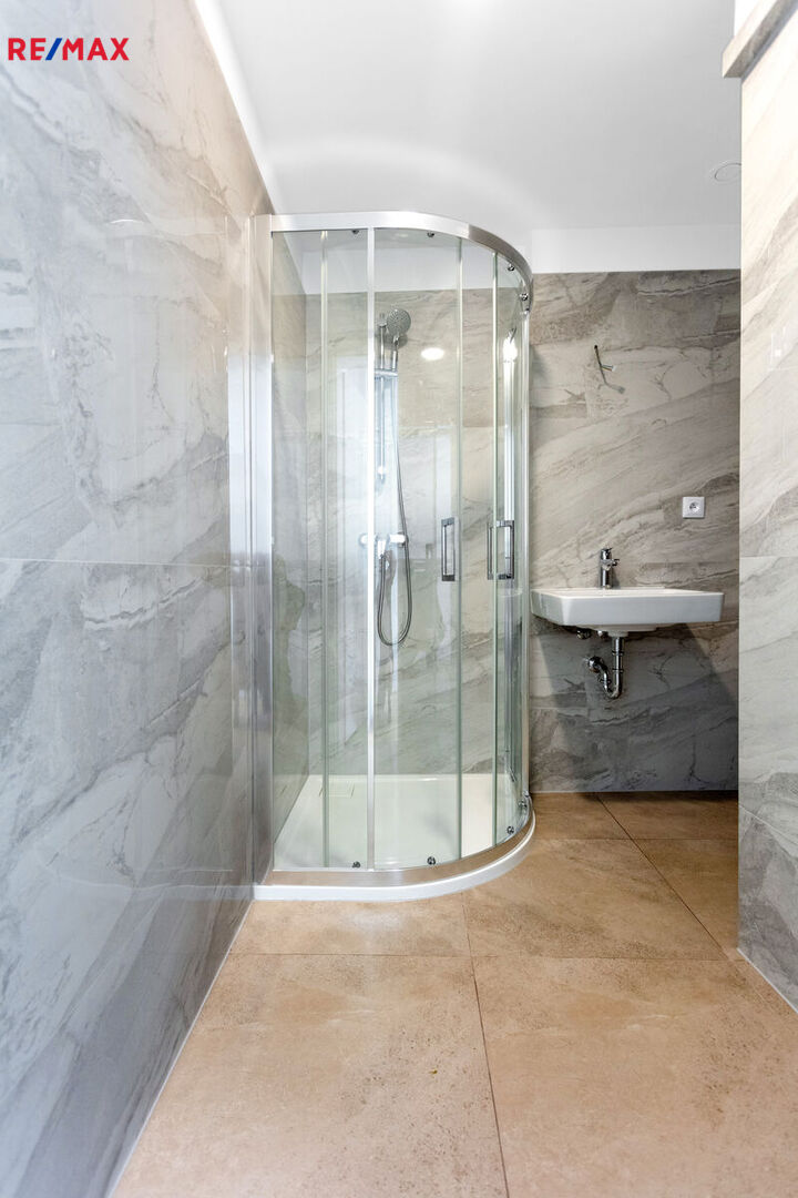 Jedná o byt o dispozici 1+kk o ploše 19,4 m2 nacházející se v 1. nadzemním podlaží (přízemí). Byty mají nové dřevěné plovoucí podlahy, nová špaletová okna s dvojsklem i venkovní roletou, jsou vybaveny rekuperací a elektrickým vytápěním.