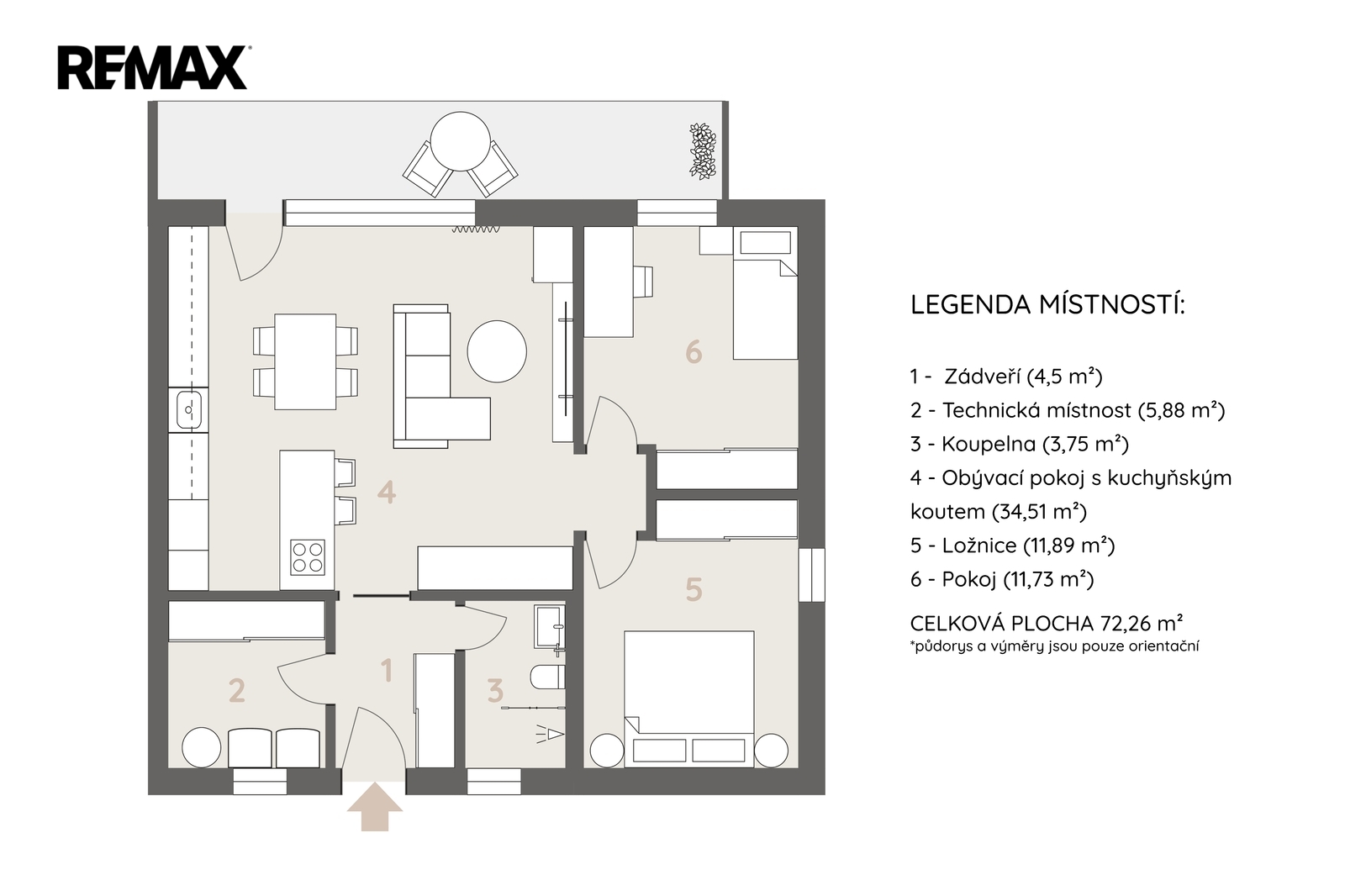 Dispoziční rodinného domu je praktické a funkční. Po vstupu do domu se nachází zádveří (4,5 m²), ze kterého je přístup do koupelny (3,75 m²), technické místnosti (5,88 m²) a hlavního obytného prostoru. Ten tvoří obývací pokoj s kuchyňským koutem (34,51 m²), odkud je dále vstup do ložnice 11,89 m²) a samostatného pokoje 11,73 m²). Z obývací části je přímý vstup na terasu přes francouzská okna, která zajišťují dostatek denního světla a propojení interiéru se zahradou.
