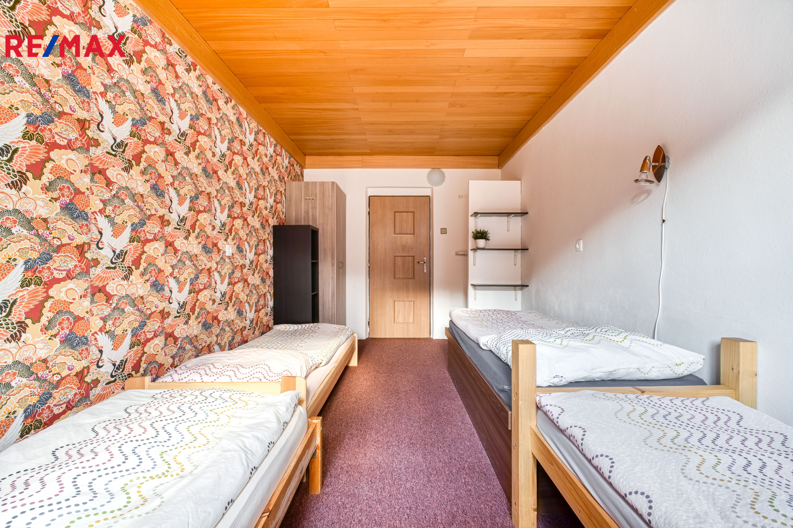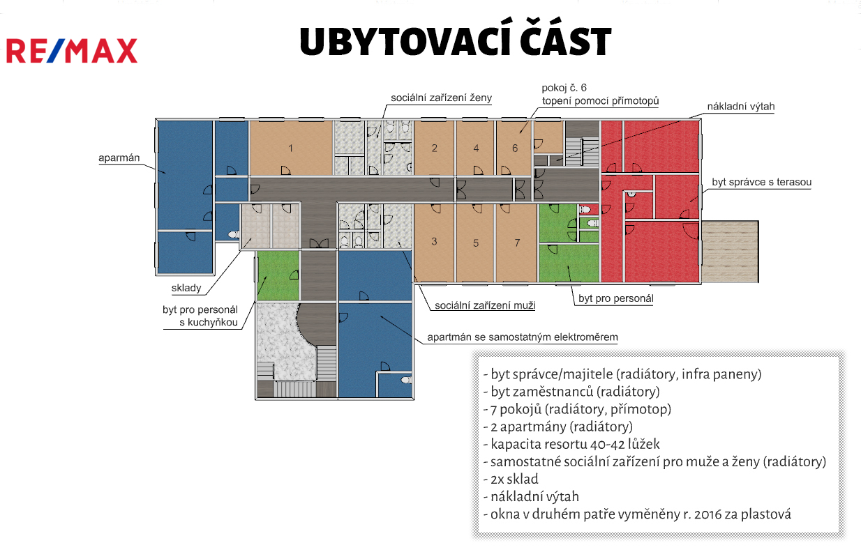V patře je ubytovací část se 7 pokoji, 2 apartmány s vlastní koupelnou, byty pro personál a samostatný byt 2+1 pro majitele či správce.