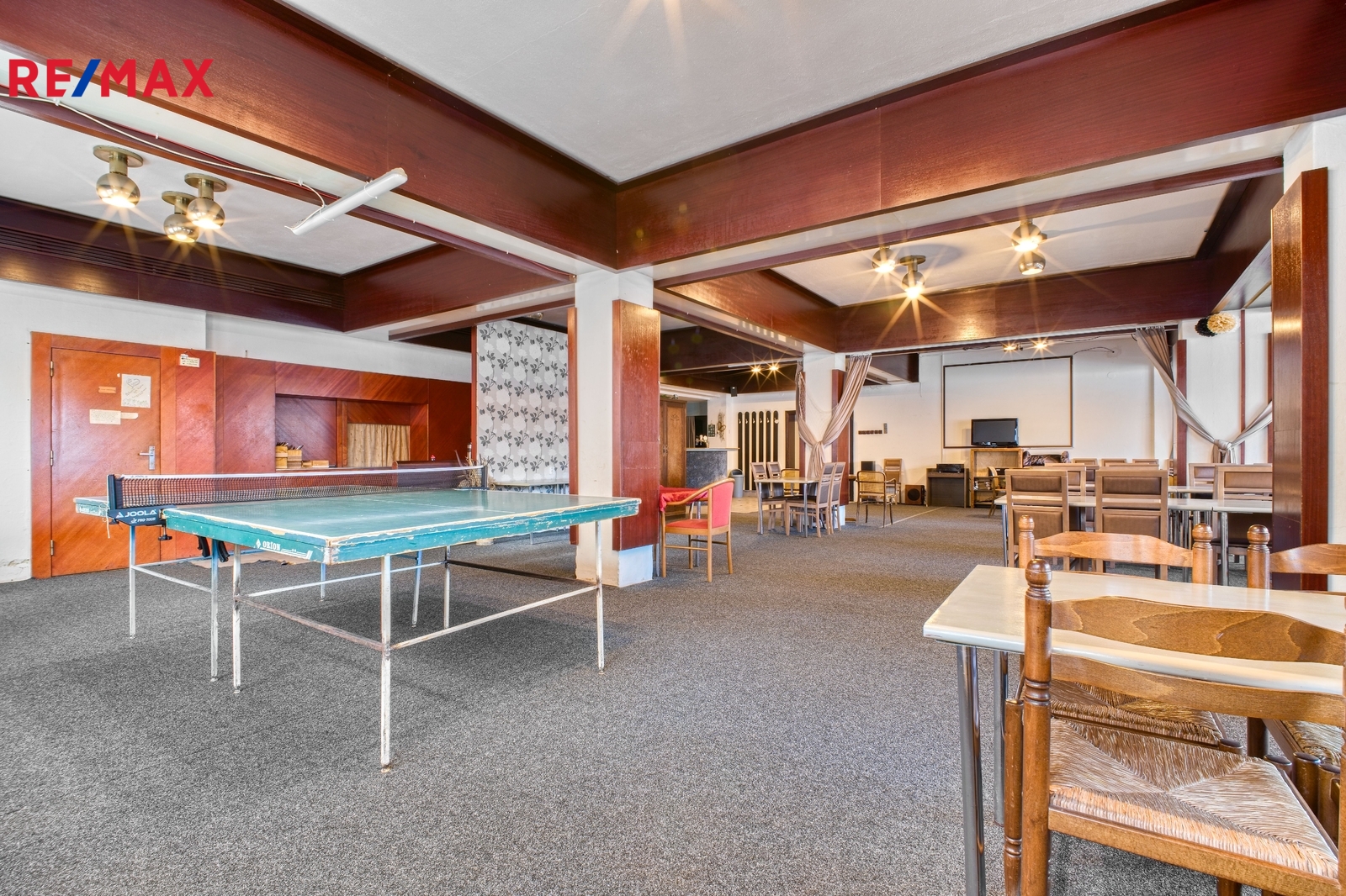 V přízemí se nachází plně funkční zázemí restaurace s barem a jídelnou, vybavená gastro kuchyně, sociální zařízení, sklady, kancelář i technické zázemí. Přímý vstup vede na venkovní zahrádku a do areálu s bazénem a sportovišti kde je i prostor na vybudování dalších aktivit pro návštěvníky.