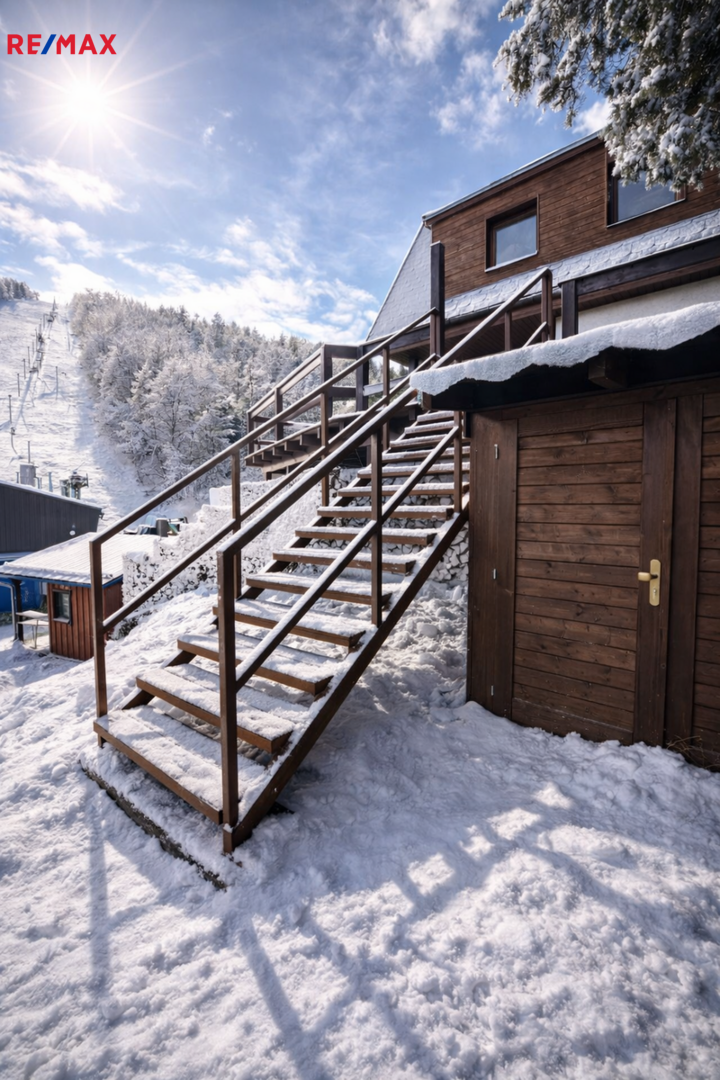 Nabízíme k prodeji moderně řešenou chalupu v atraktivní alpské architektuře, situovanou přímo naproti sjezdovce Slalomák, která je součástí skiareálu Bouřňák – vyhledávaného lyžaři, skialpinisty, ale i milovníky cyklistiky, turistiky a nordic walkingu.