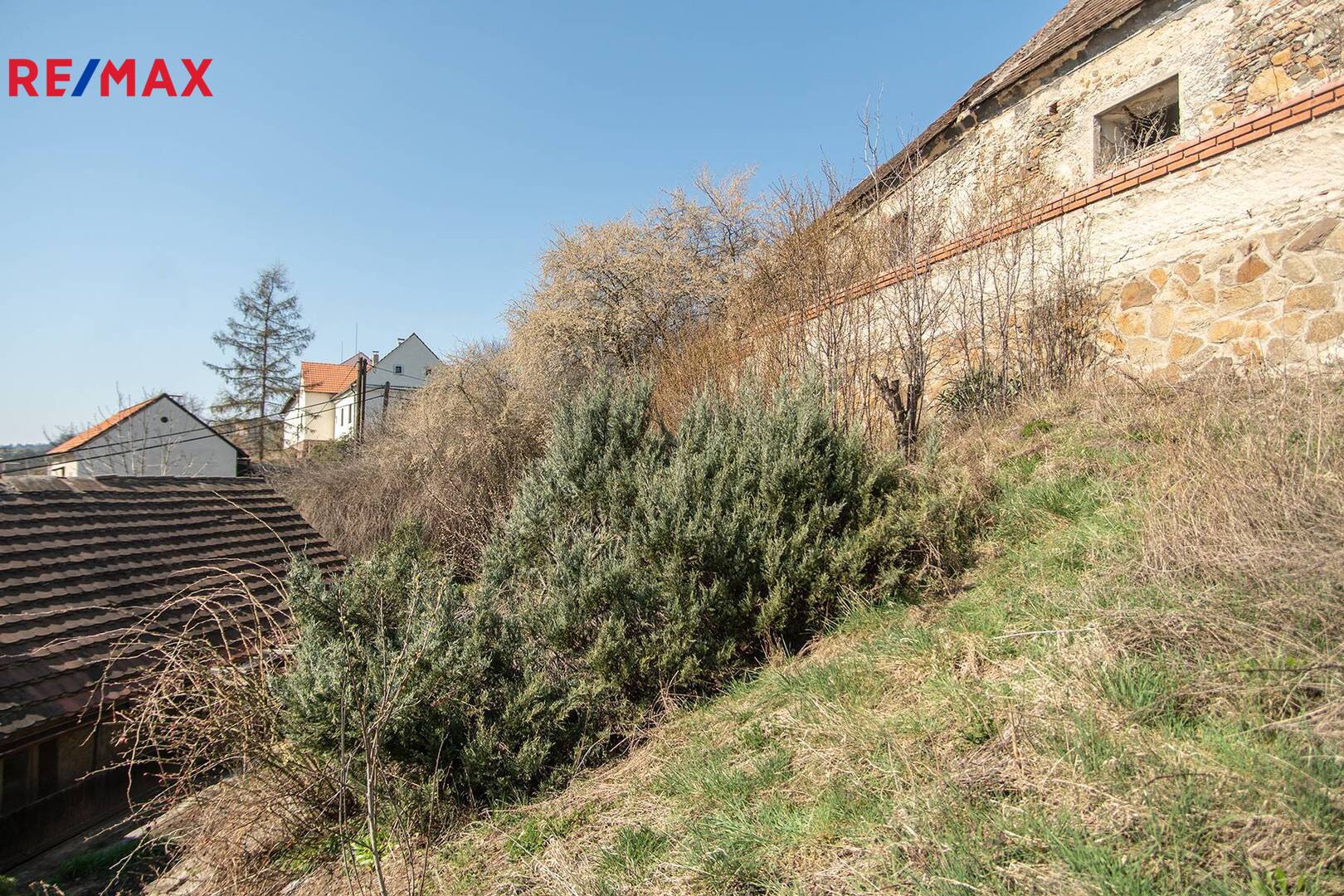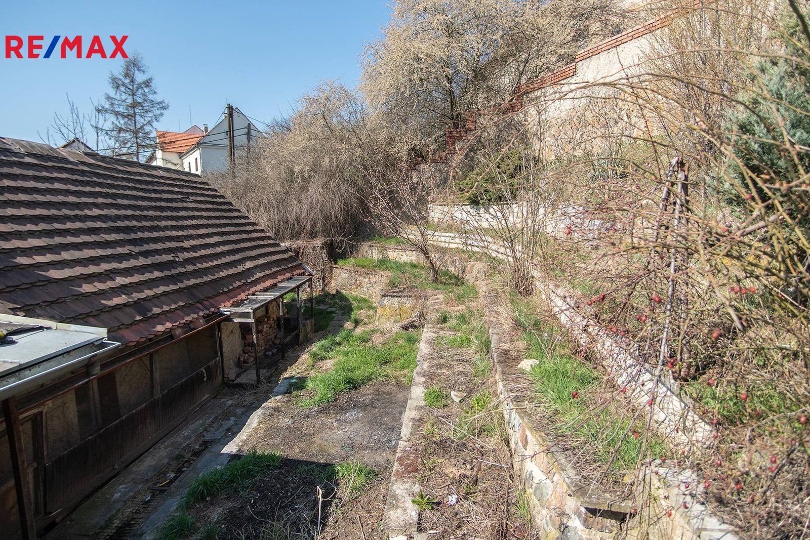 Přilehlá terasovitá zahrada je velká tak akorát, abyste na ní mohli pěstovat bylinky a okrasné dřeviny, a nemuseli celý víkend trávit sekáním trávy.