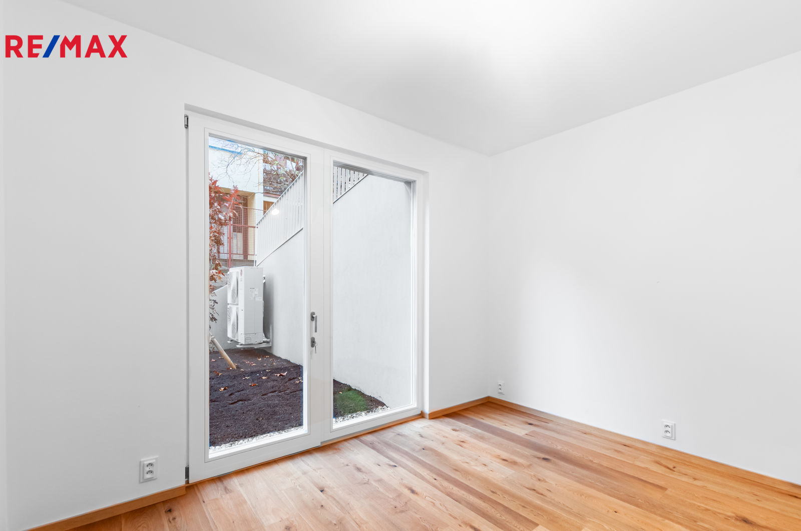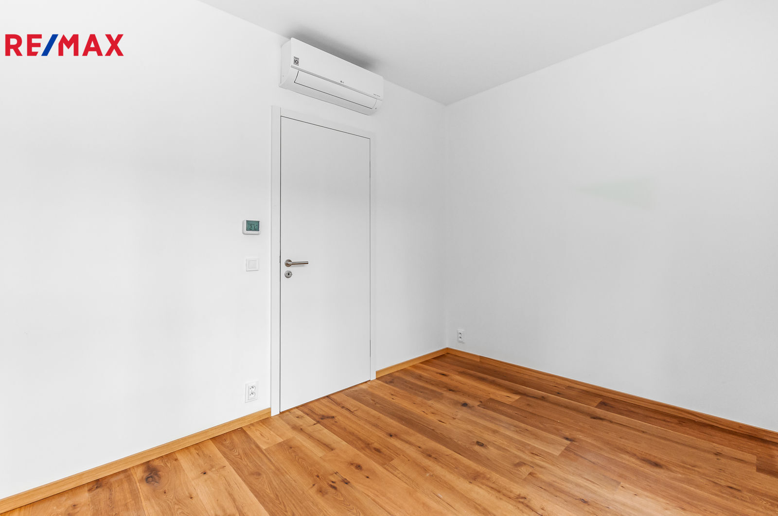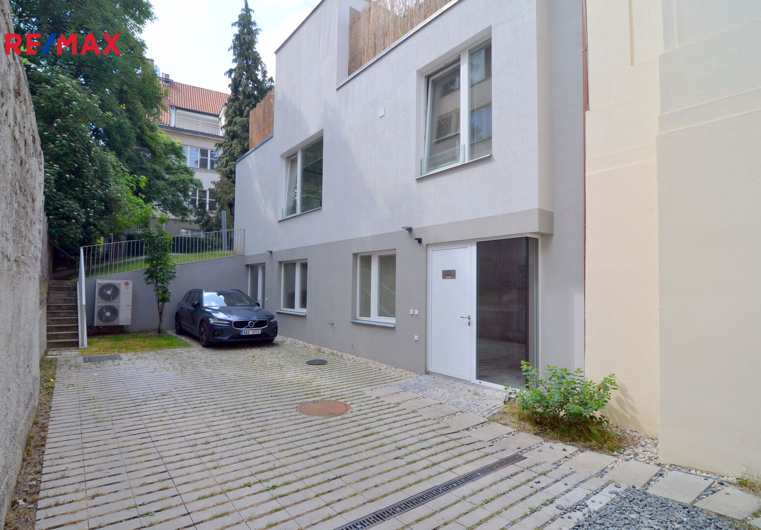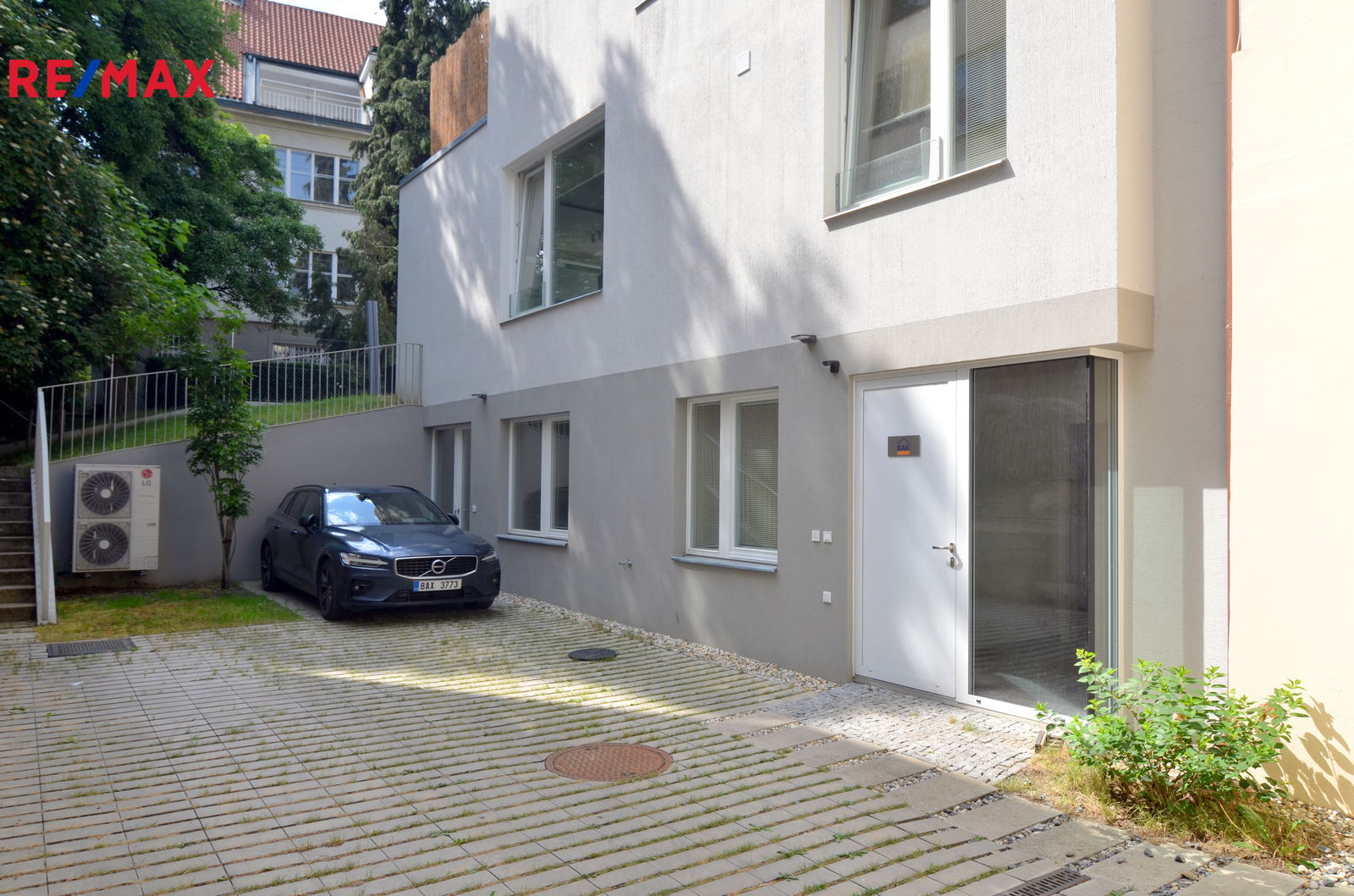 a samozřejmostí je i klimatizace. Byt se nachází v prvním a druhém nadzemním podlaží. Z prostorné vstupní haly (7 m2) doplněné menší komorou a vestavnou skříní se vchází do chodby odkud jsou přístupné tři místnosti, dvě ložnice (každá 10 m2) a pracovna či další ložnice pro hosty (7 m2). Z jedné z těchto ložnic je i přímý výstup na spodní část pozemku, která se užívá pouze s tímto bytem. V tomto podlaží je k dispozici ještě koupelna s vanou a WC a také samostatné WC s umyvadlem. Z chodby vystoupáte po dřevěném schodišti do velkorysého obývacího pokoje o velikosti 42 m2 s kuchyňskou linkou. Ta je vybavena lednicí s mrazákem, myčkou, dřezem, varnou deskou a elektrickou troubou. Odvětrání je zajištěno pomocí digestoře. Z obývacího pokoje za kuchyní pak vejdete do ložnice rodičů (13,6 m2), která je doplněna vlastní koupelnou se sprchovým koutem a WC. Více v přiložených půdorysech. Dominantou obývacího pokoje je velká prosklená stěna, na kterou navazuje zpevněná dřevěná terasa (15 m2) s jižní orientací. Okolo východní a jižní strany bytu se nachází dvouúrovňová předzahrádka spojená schodištěm. U vstupu do bytu pak jsou k dispozici 2 parkovací stání, která je možno si pronajmout spolu s bytem - obě za 3.000,- Kč měsíčně.