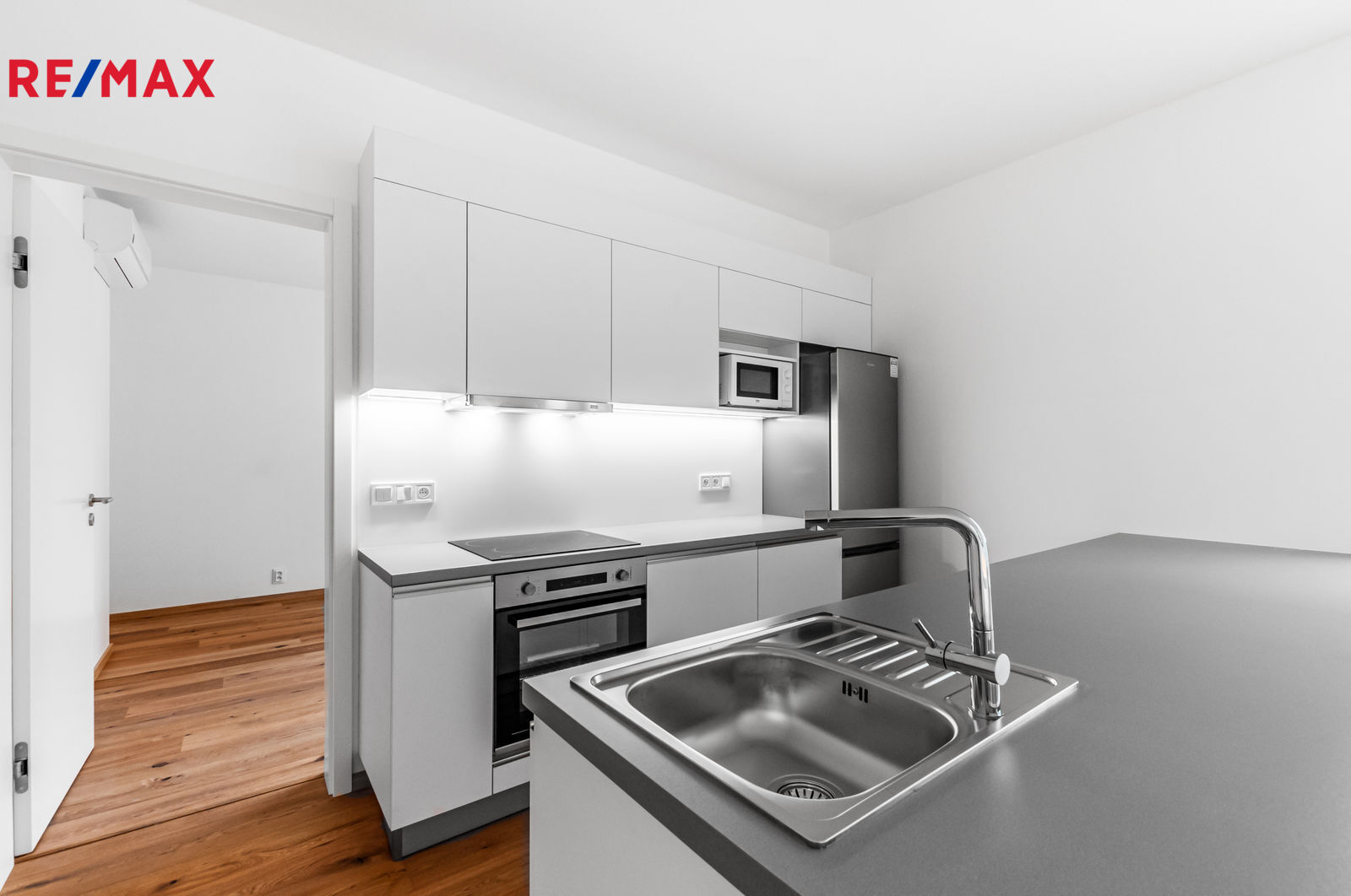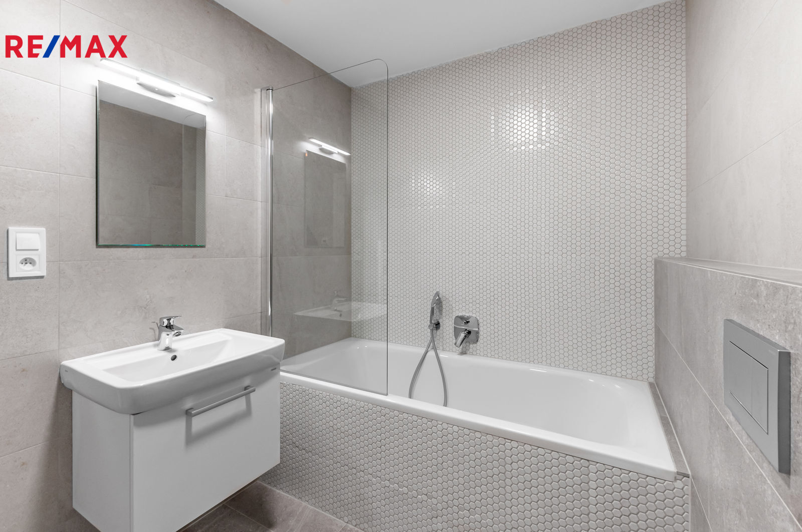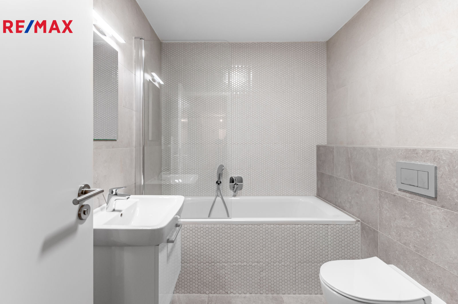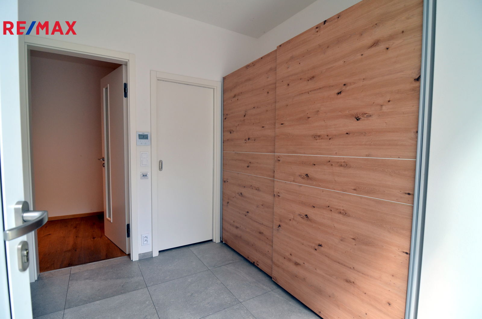 a samozřejmostí je i klimatizace. Byt se nachází v prvním a druhém nadzemním podlaží. Z prostorné vstupní haly (7 m2) doplněné menší komorou a vestavnou skříní se vchází do chodby odkud jsou přístupné tři místnosti, dvě ložnice (každá 10 m2) a pracovna či další ložnice pro hosty (7 m2). Z jedné z těchto ložnic je i přímý výstup na spodní část pozemku, která se užívá pouze s tímto bytem. V tomto podlaží je k dispozici ještě koupelna s vanou a WC a také samostatné WC s umyvadlem. Z chodby vystoupáte po dřevěném schodišti do velkorysého obývacího pokoje o velikosti 42 m2 s kuchyňskou linkou. Ta je vybavena lednicí s mrazákem, myčkou, dřezem, varnou deskou a elektrickou troubou. Odvětrání je zajištěno pomocí digestoře. Z obývacího pokoje za kuchyní pak vejdete do ložnice rodičů (13,6 m2), která je doplněna vlastní koupelnou se sprchovým koutem a WC. Více v přiložených půdorysech. Dominantou obývacího pokoje je velká prosklená stěna, na kterou navazuje zpevněná dřevěná terasa (15 m2) s jižní orientací. Okolo východní a jižní strany bytu se nachází dvouúrovňová předzahrádka spojená schodištěm. U vstupu do bytu pak jsou k dispozici 2 parkovací stání, která je možno si pronajmout spolu s bytem - obě za 3.000,- Kč měsíčně.