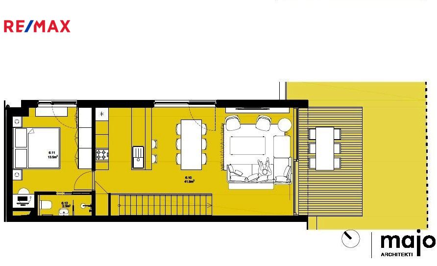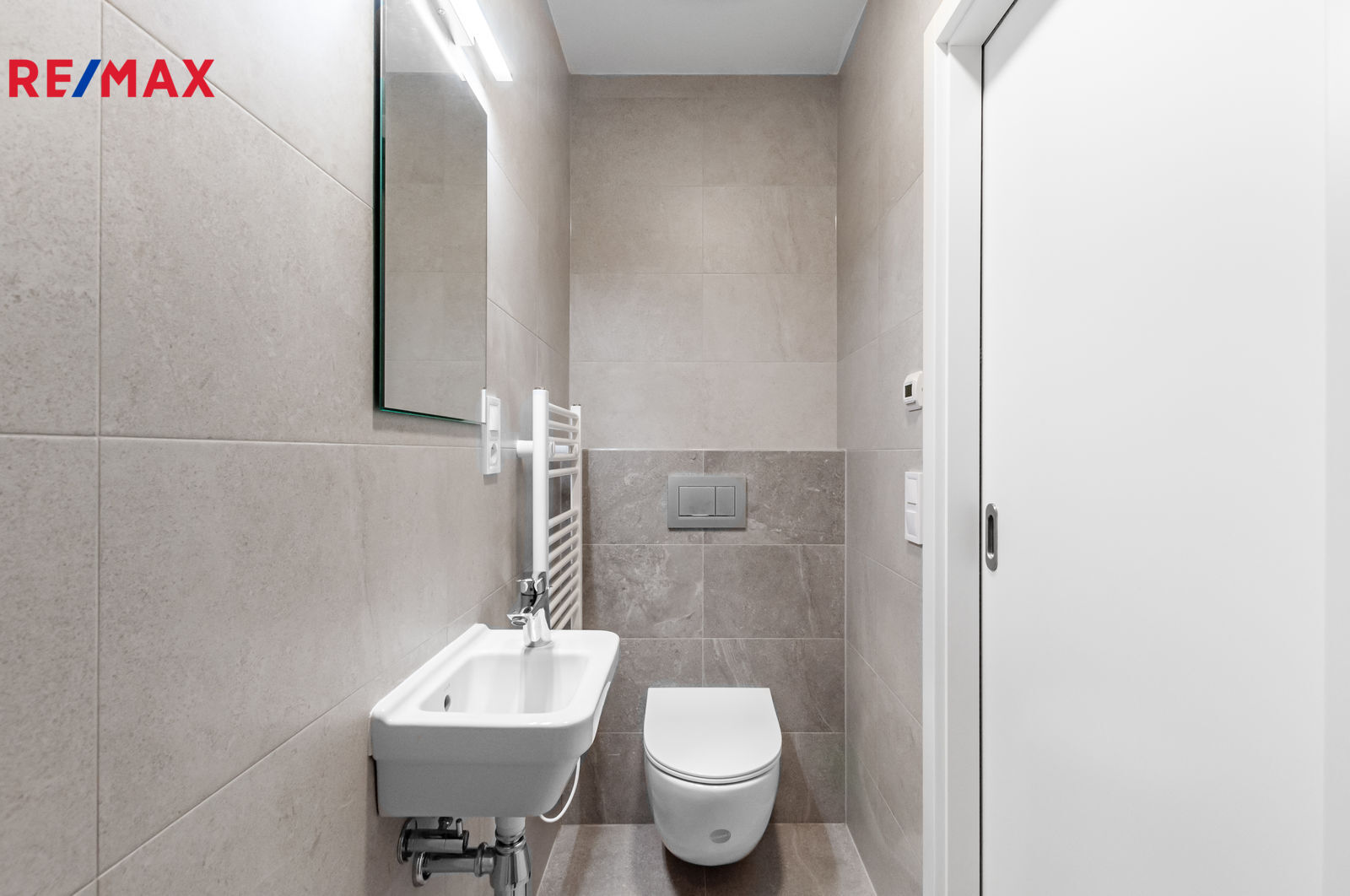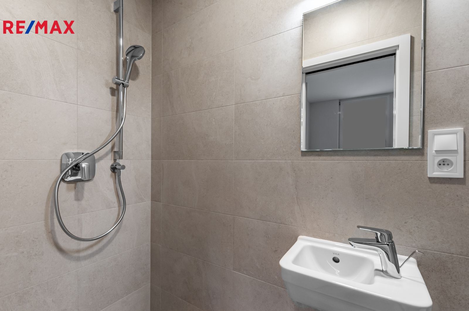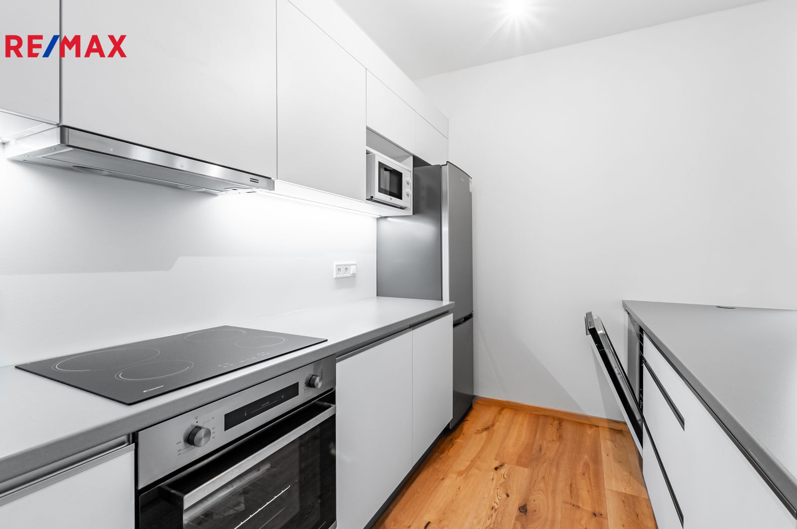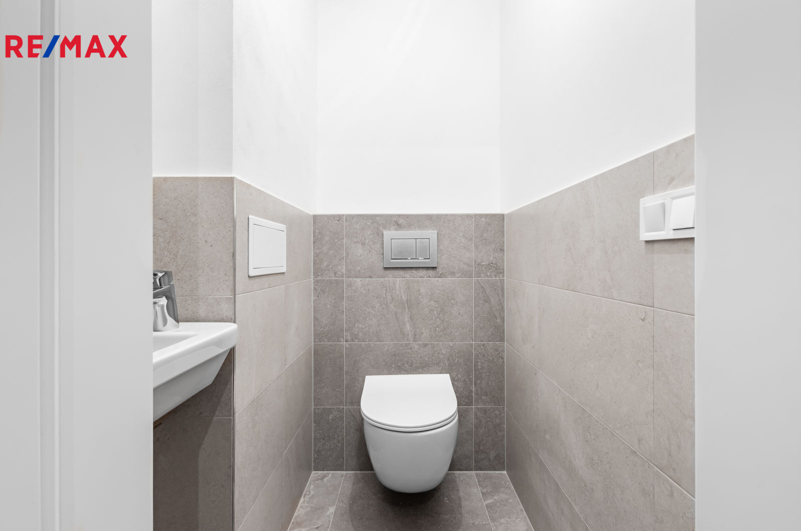 a samozřejmostí je i klimatizace. Byt se nachází v prvním a druhém nadzemním podlaží. Z prostorné vstupní haly (7 m2) doplněné menší komorou a vestavnou skříní se vchází do chodby odkud jsou přístupné tři místnosti, dvě ložnice (každá 10 m2) a pracovna či další ložnice pro hosty (7 m2). Z jedné z těchto ložnic je i přímý výstup na spodní část pozemku, která se užívá pouze s tímto bytem. V tomto podlaží je k dispozici ještě koupelna s vanou a WC a také samostatné WC s umyvadlem. Z chodby vystoupáte po dřevěném schodišti do velkorysého obývacího pokoje o velikosti 42 m2 s kuchyňskou linkou. Ta je vybavena lednicí s mrazákem, myčkou, dřezem, varnou deskou a elektrickou troubou. Odvětrání je zajištěno pomocí digestoře. Z obývacího pokoje za kuchyní pak vejdete do ložnice rodičů (13,6 m2), která je doplněna vlastní koupelnou se sprchovým koutem a WC. Více v přiložených půdorysech. Dominantou obývacího pokoje je velká prosklená stěna, na kterou navazuje zpevněná dřevěná terasa (15 m2) s jižní orientací. Okolo východní a jižní strany bytu se nachází dvouúrovňová předzahrádka spojená schodištěm. U vstupu do bytu pak jsou k dispozici 2 parkovací stání, která je možno si pronajmout spolu s bytem - obě za 3.000,- Kč měsíčně.