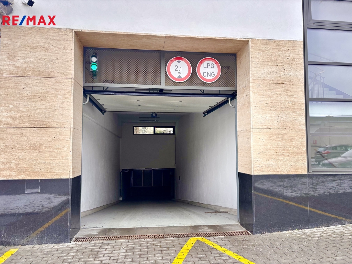 Moderní objekt je vybaven kamerovým systémem a vstup do garáže je zabezpečen pomocí čipu, což přispívá k celkovému zvýšení bezpečnosti.