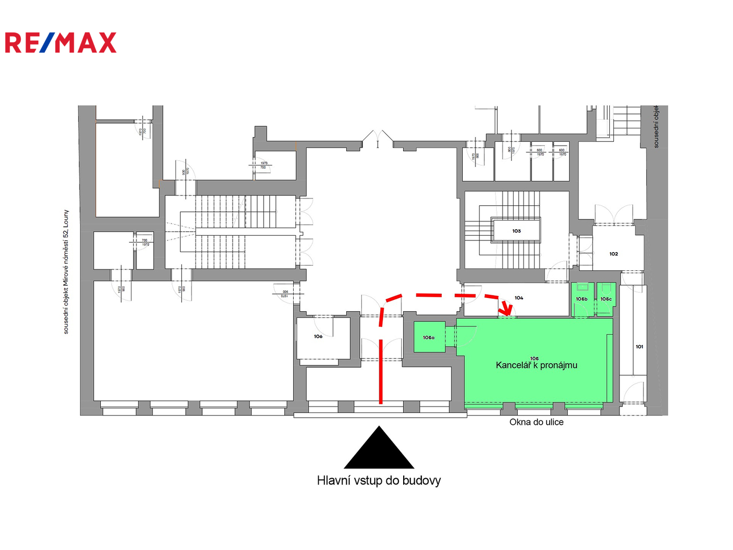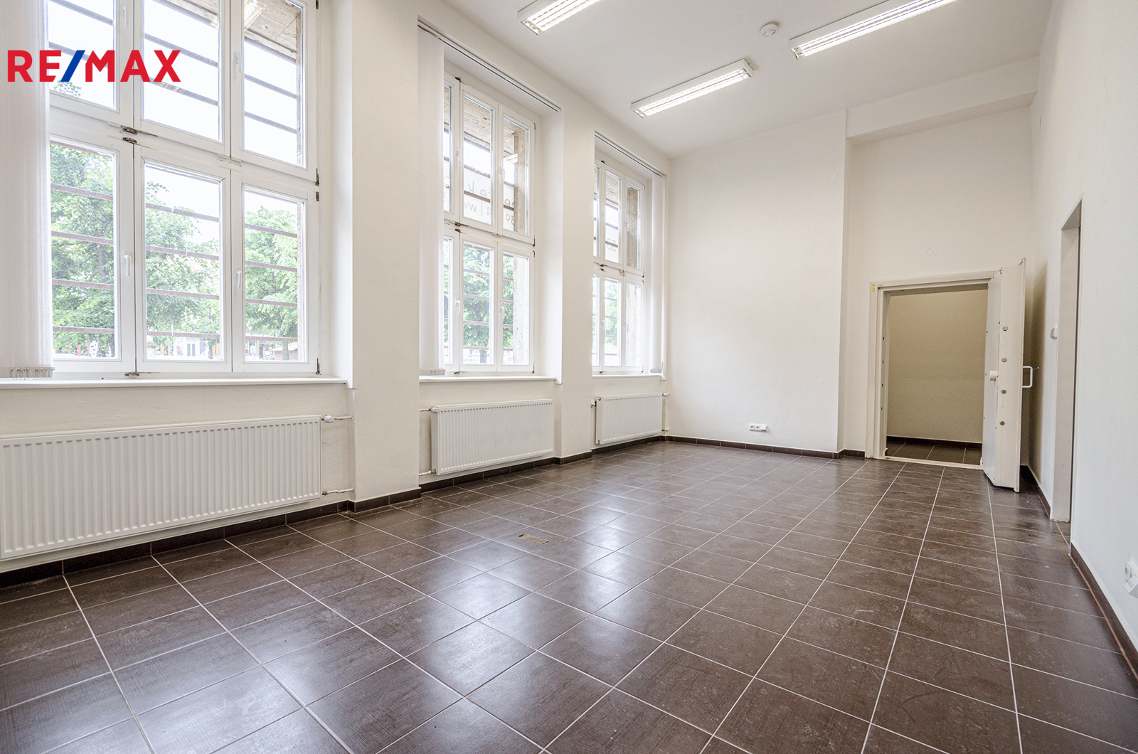 Nabízíme Vám k dlouhodobému pronájmu kancelář na exkluzivní adrese v budově Spořitelny ve centru Loun na Mírovém náměstí. Celková plocha 31,2 m2. Součástí kanceláře je toaleta, prostor s umyvadlem a také velký trezor. Rozměr samotné kanceláře je 6,75 m x 3,80 m. Výška prostor je 3,9 m. Kanceláře jsou vybaveny 3 okny směřujícími do ulice. Na podlaze prostor je dlažba.