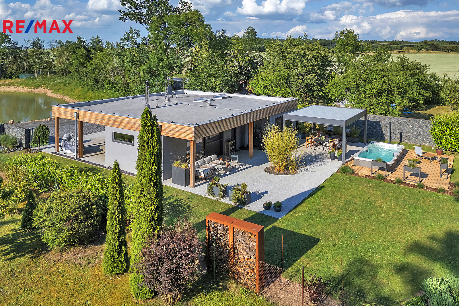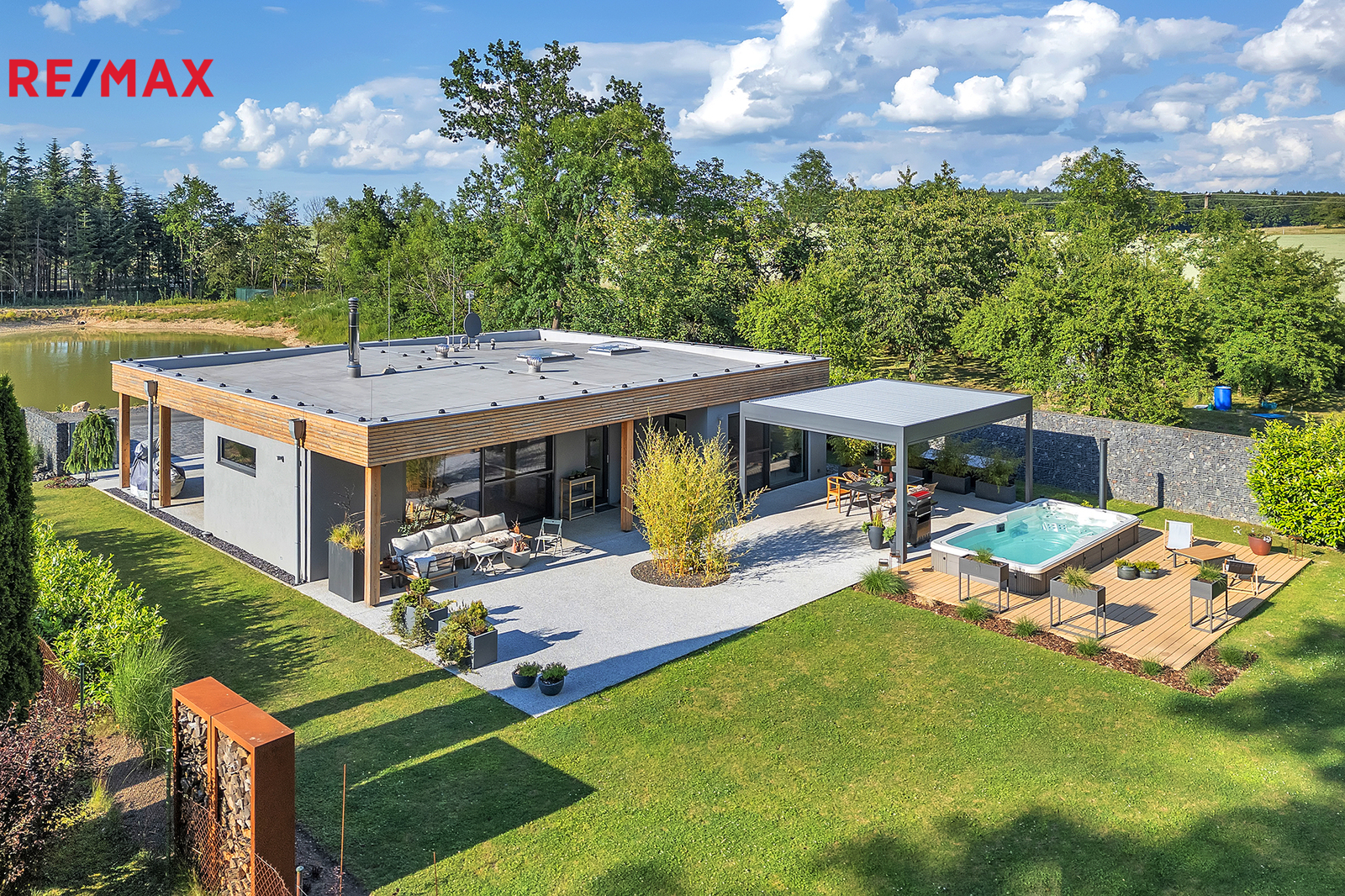 Venkovní vybavení domu – Bioklimatická hliníková pergola 24m2, s otočnými lamelami a ze všech stran opatřená dle potřeby el. roletami se senzory proti dešti a větru. Celoroční vířivka, protiproud, osvětlení, Canadian Spa zn. Mollus 10m2 s pískovou filtrací. Terasa TERAFEST premium, betony a kamenný koberec PIEDRA. Zahradní dřevěný domek 14m2 včetně regálového systému. Z poloviny pozemku oplocení GABION. Brána na el. pohon, videotelefon, 3x bezpečnostní kamera.