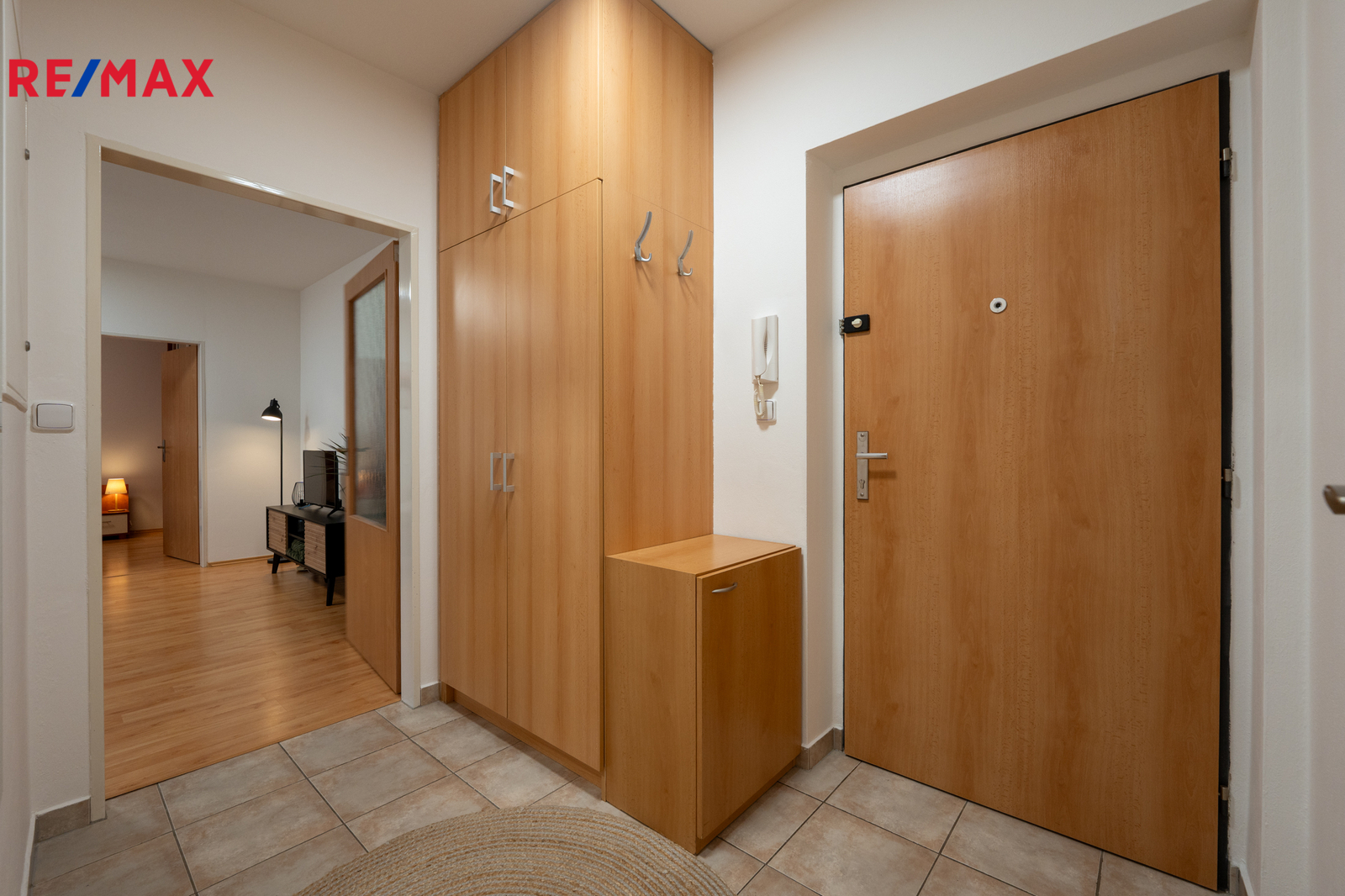 Dispozice bytu nabízí prostornou vstupní chodbu, ze které je vstup do velmi pěkné a prostorné koupelny s vanou a toaletou. Dále se vchází do světlého obývacího pokoje, který je kompletně zařízen – pohodlná sedací souprava, konferenční stolek, TV stolek s televizí, jídelní stůl a vybavená kuchyňská linka.