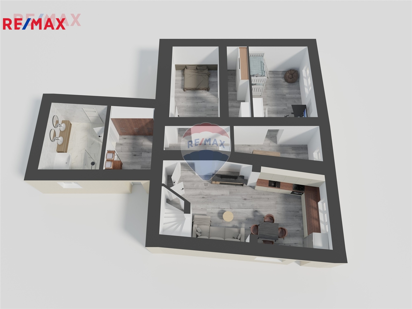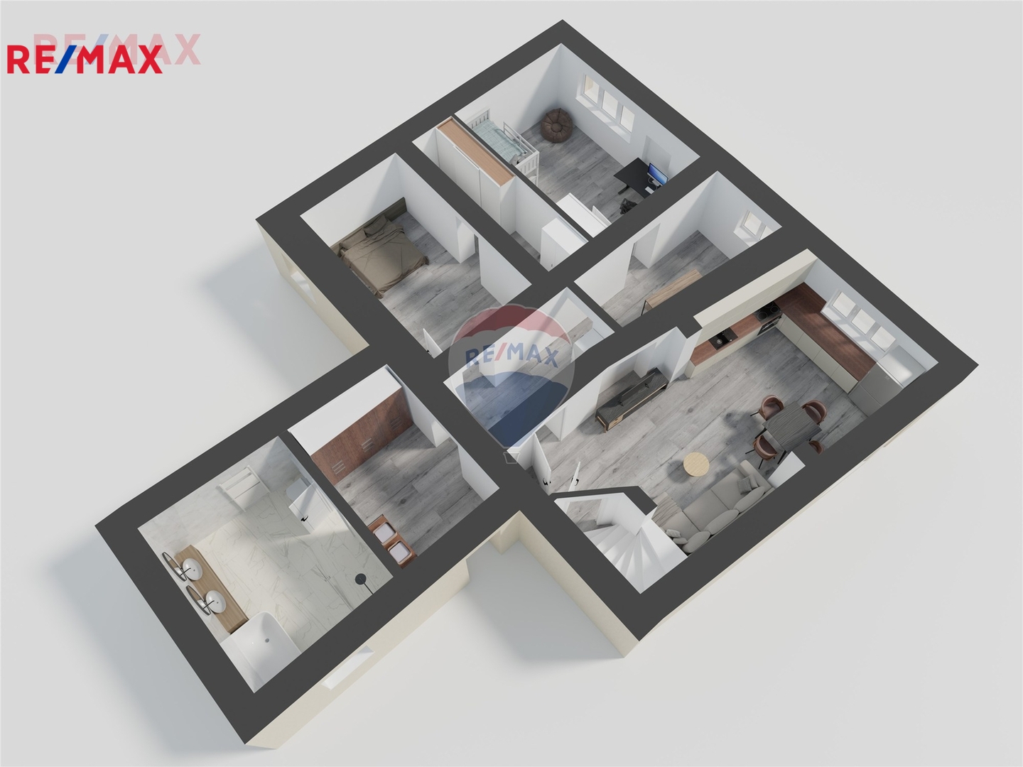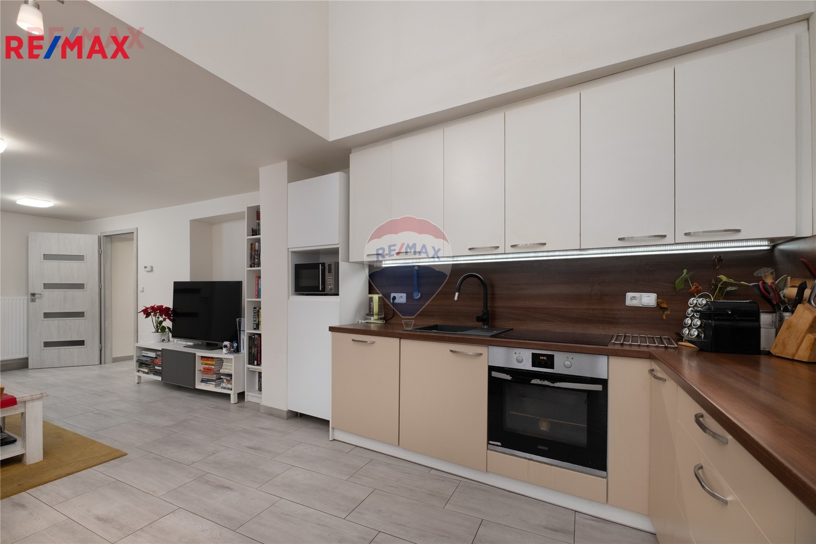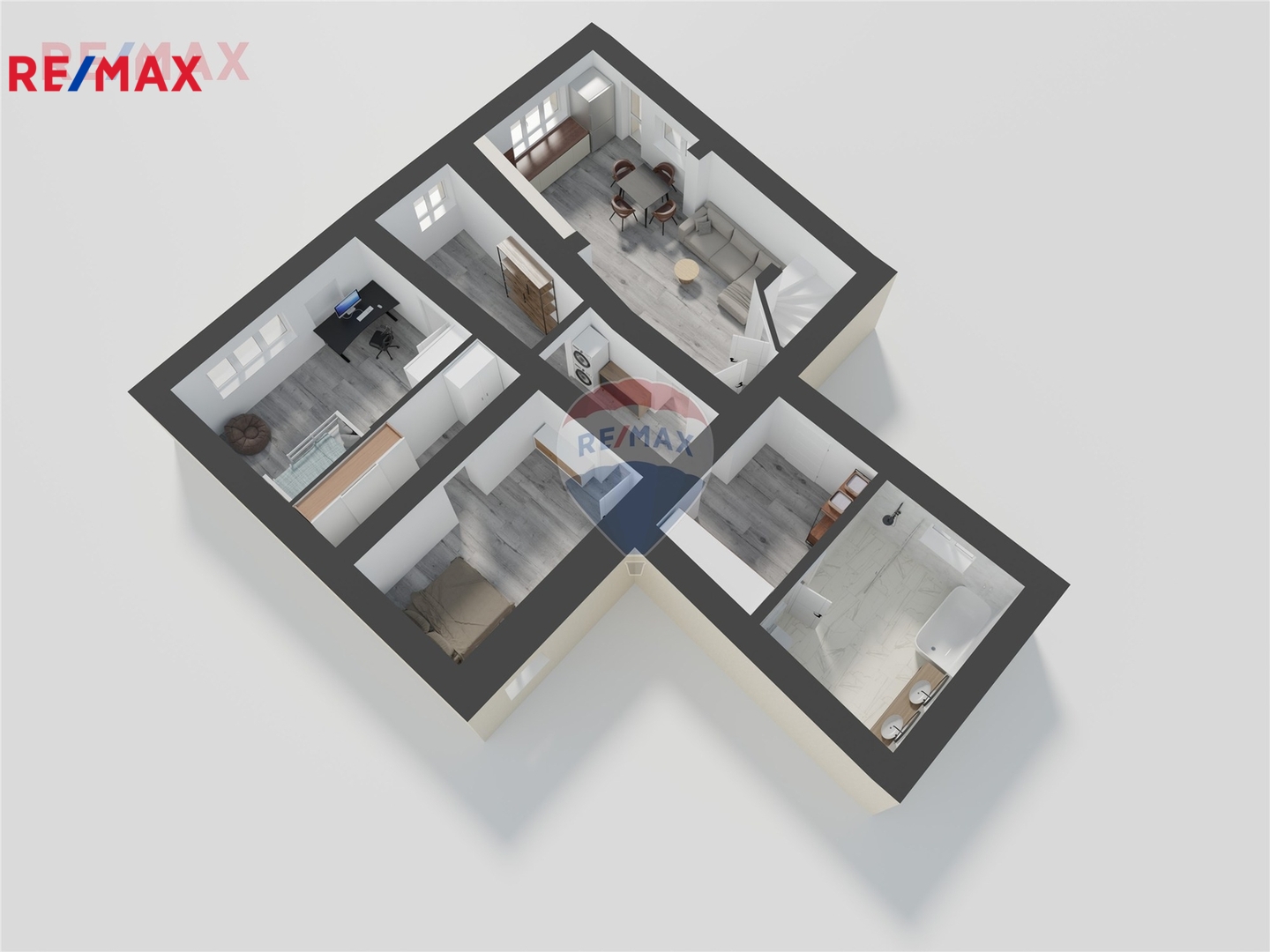 Kuchyňská linka je vybavena troubou, indukční varnou deskou a myčkou nádobí. K dispozici je elegantní koupelna s vanou i sprchovým koutem, ideální pro každodenní komfort i relax.