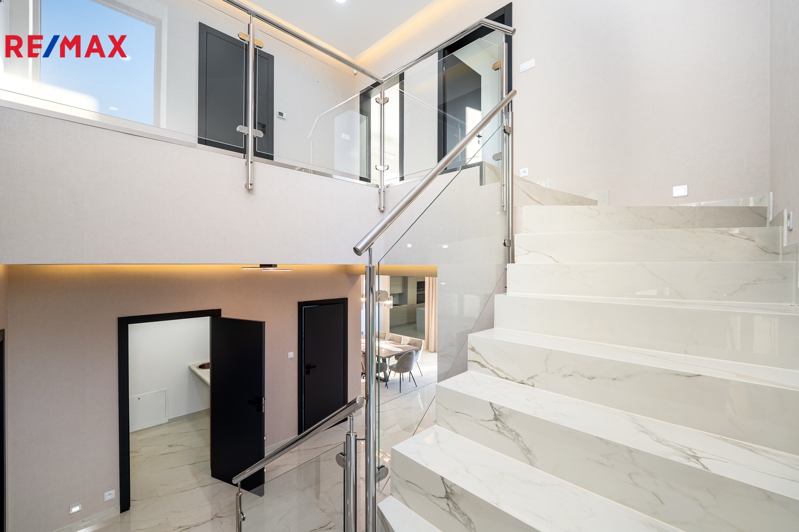Dominantou obytného prostoru je prostorné a kvalitní schodiště, které nejen elegantně spojuje jednotlivá patra domu, ale zároveň působí jako výrazný architektonický prvek, dodávající interiéru styl a charakter.