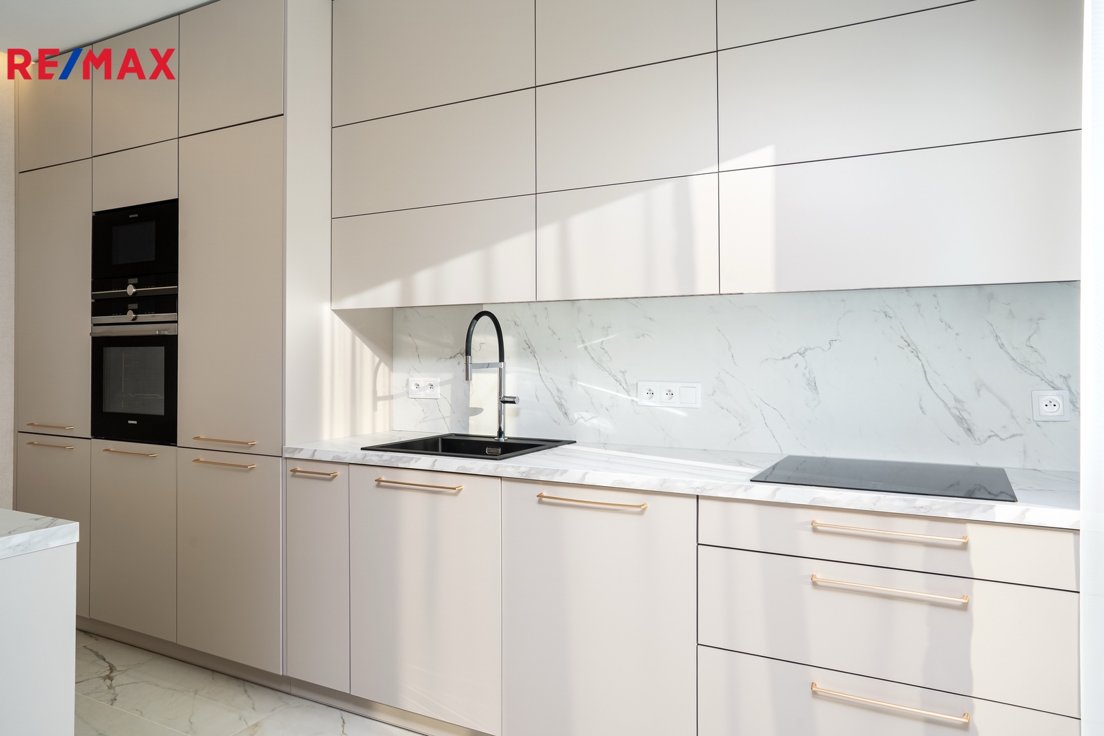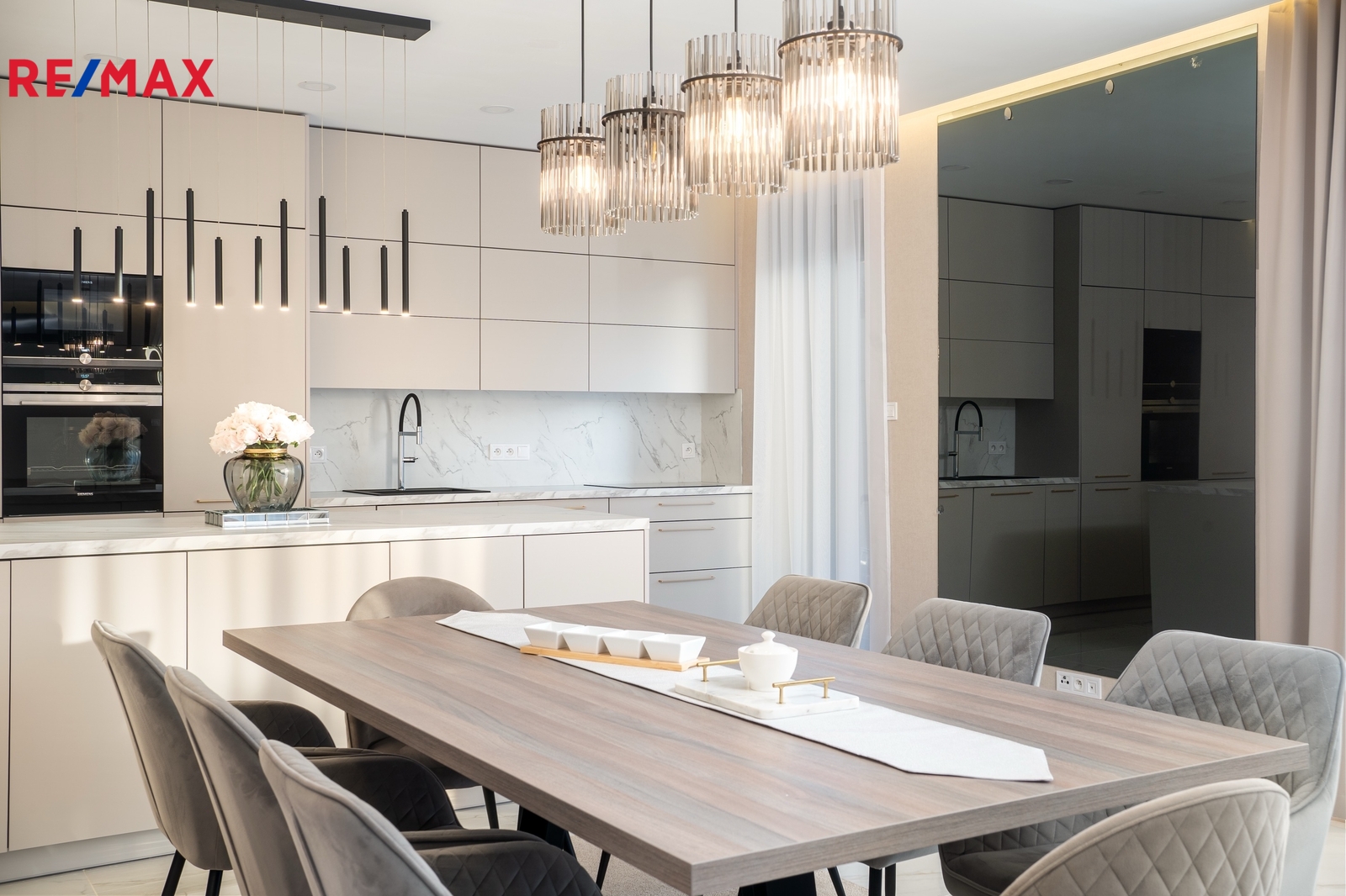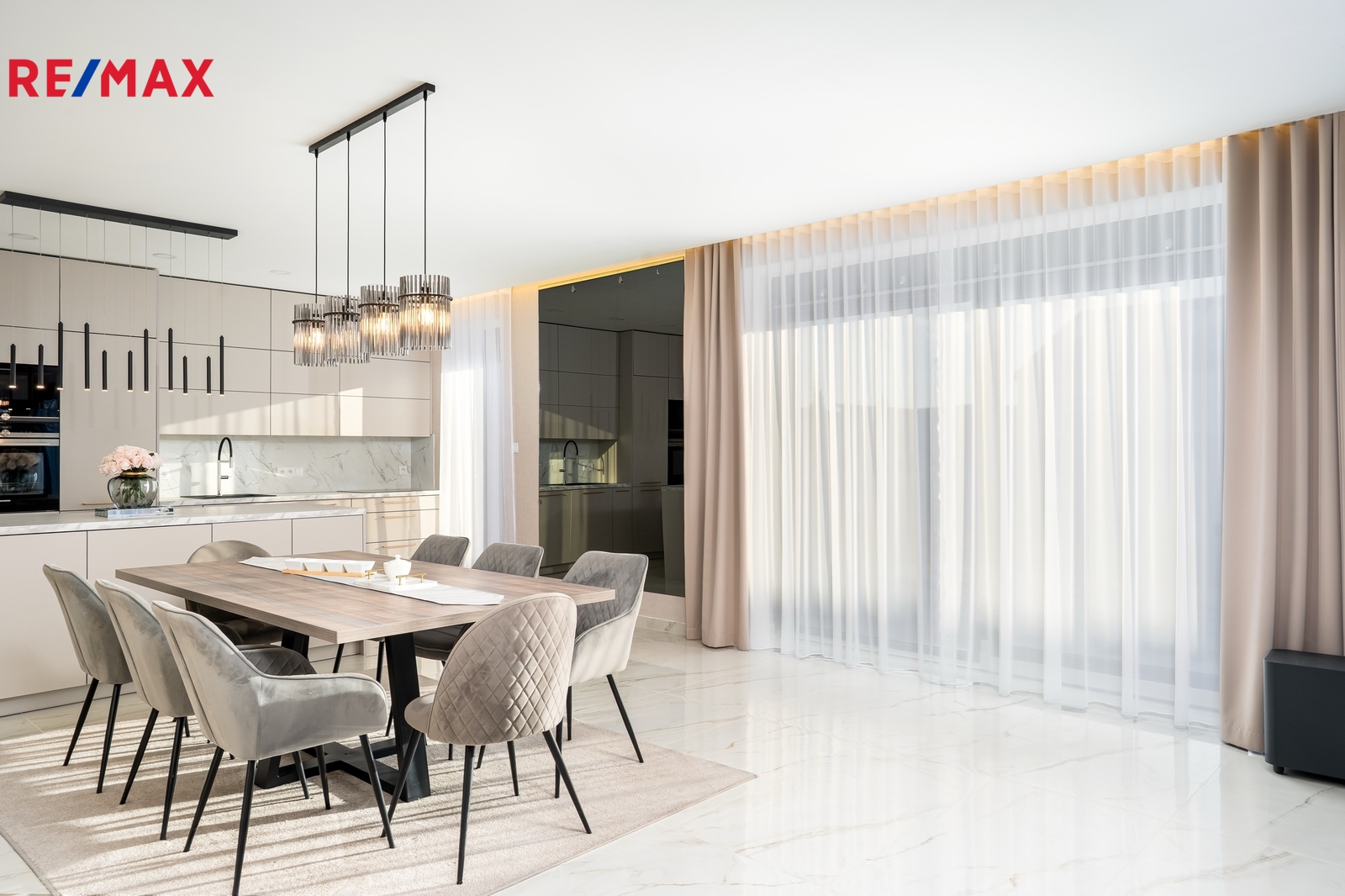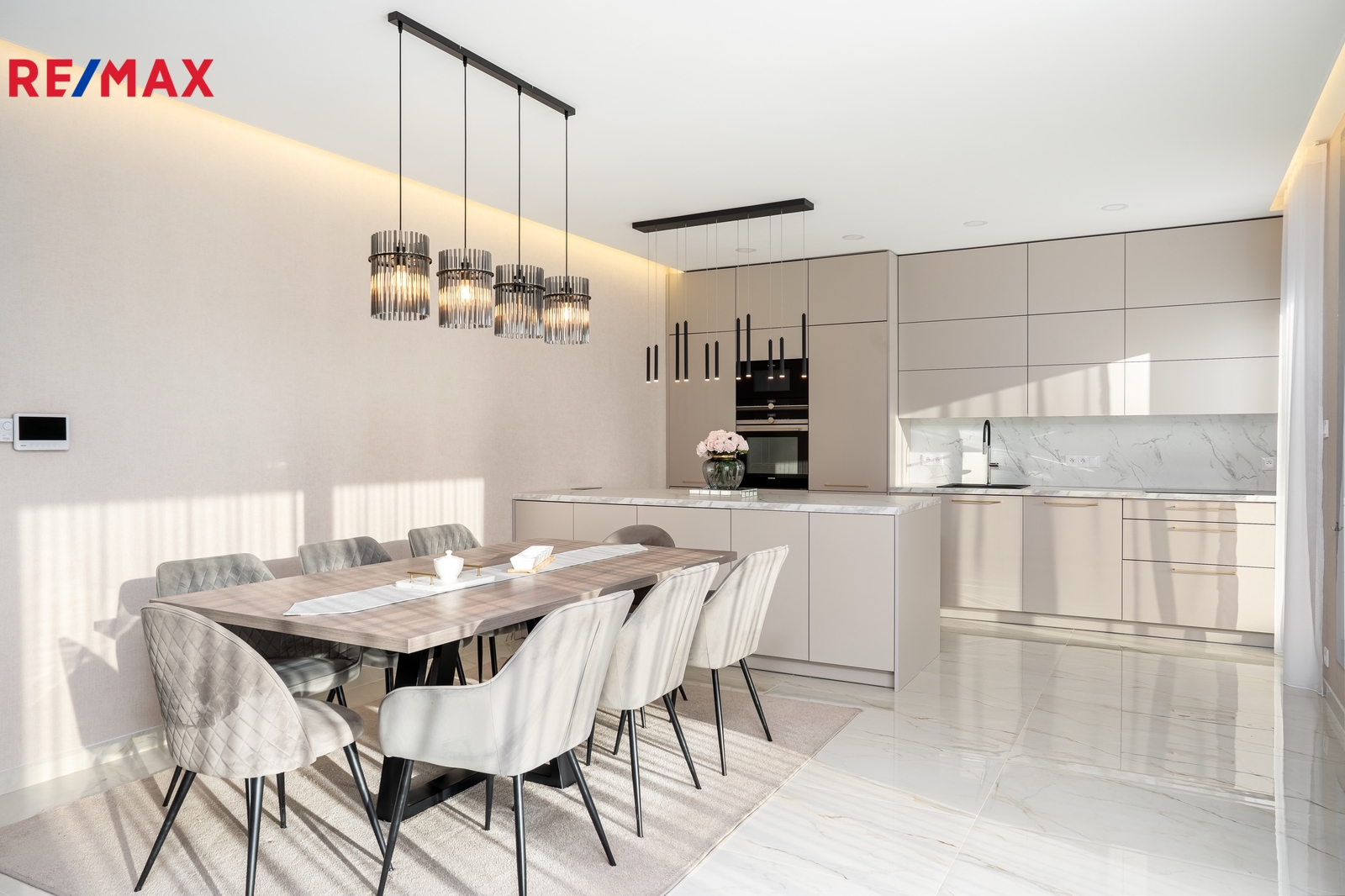 Srdcem domu je luxusní kuchyňská linka na míru, světlá, prostorná a dokonale zpracovaná, kde je radost vařit – ať už pro rodinu nebo při setkání s přáteli. Kuchyň přirozeně navazuje na obytný prostor a propojuje vaření s pohodovou atmosférou a denním světlem, které sem proudí z velkých oken.