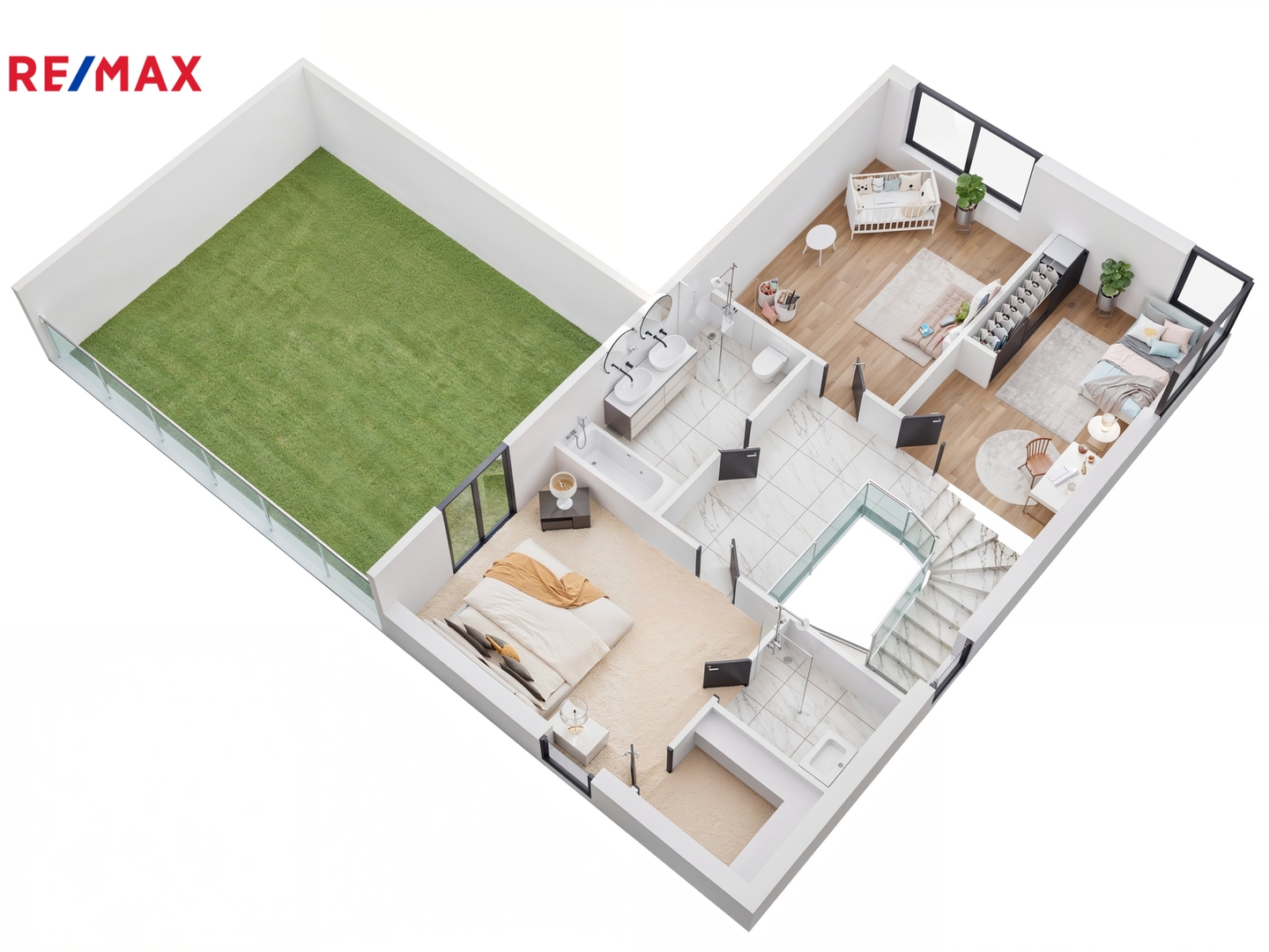 Soukromá master bedroom nabízí vlastní koupelnu, šatnu a terasu, ideální pro relaxaci, kterou lze využít například pro umístění vířivky, lehátek či posezení venku.