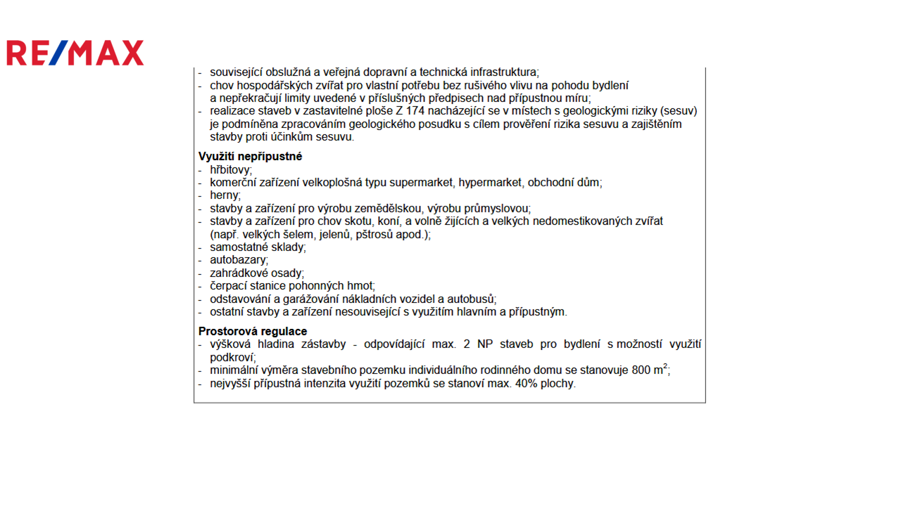Pozemek je rovinatý, dle územního plánu je veden v zastavitelném území, BI – bydlení individuální, s podmínkou realizace staveb do výšky 2.NP, s min. plochou pozemku 800m² a mírou intenzity využití pozemku pro výstavbu max. 40% plochy.