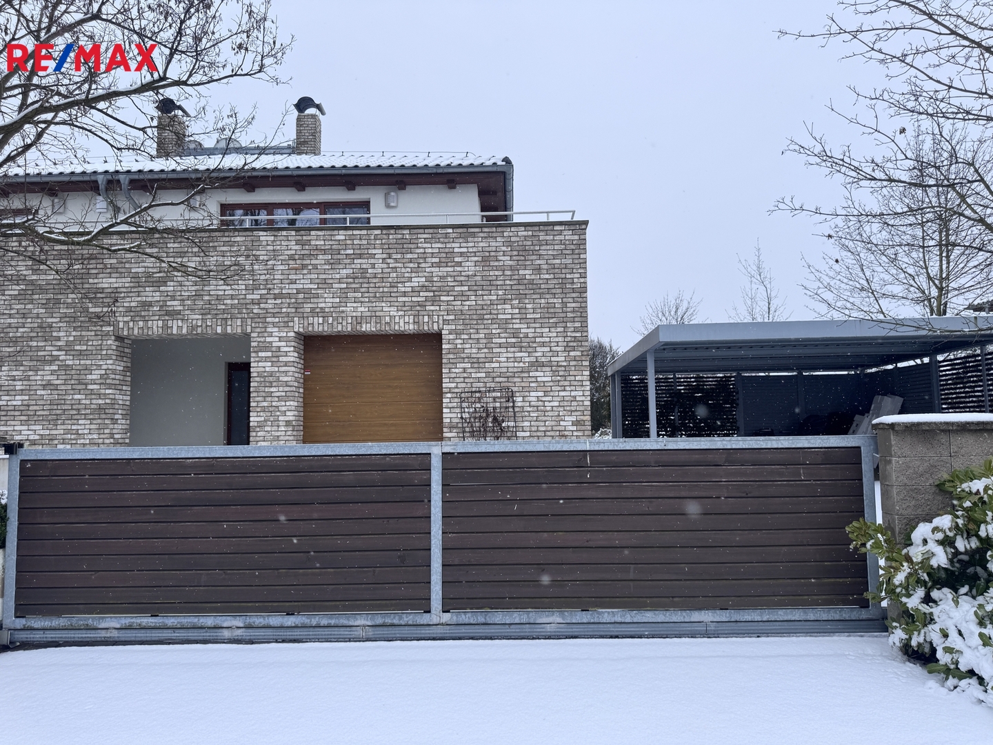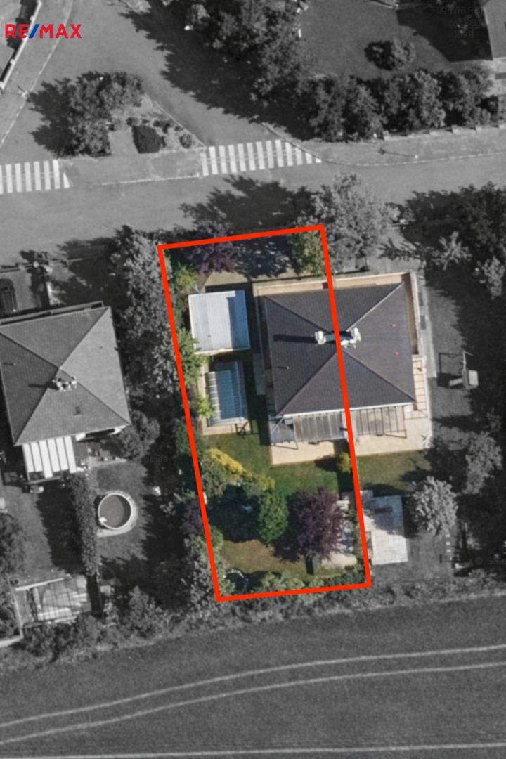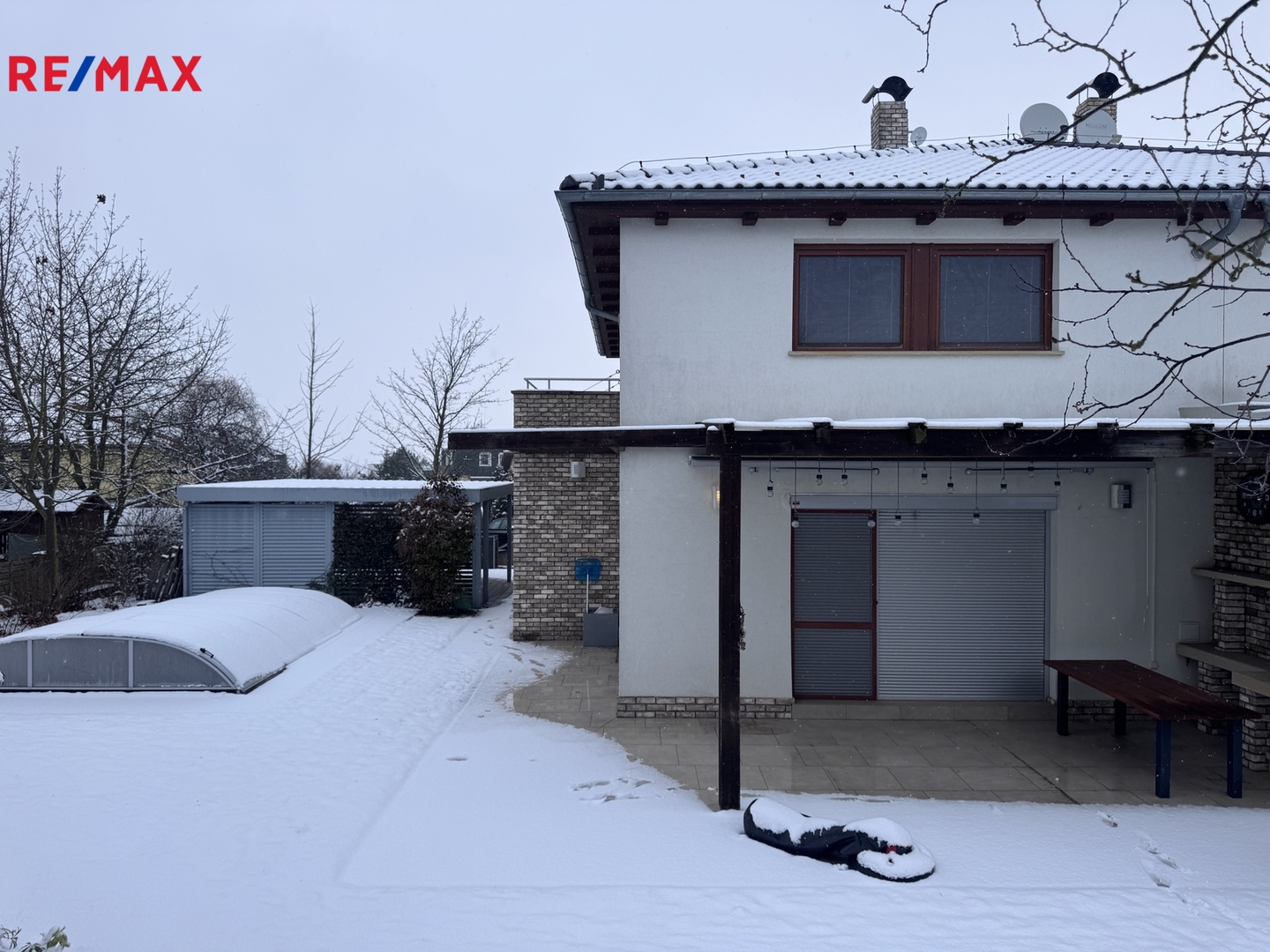 Na zahradě je venkovní krb , terasa s elektrickou markýzou , trampolína , bazén a přístřešek na parkování 2 aut.