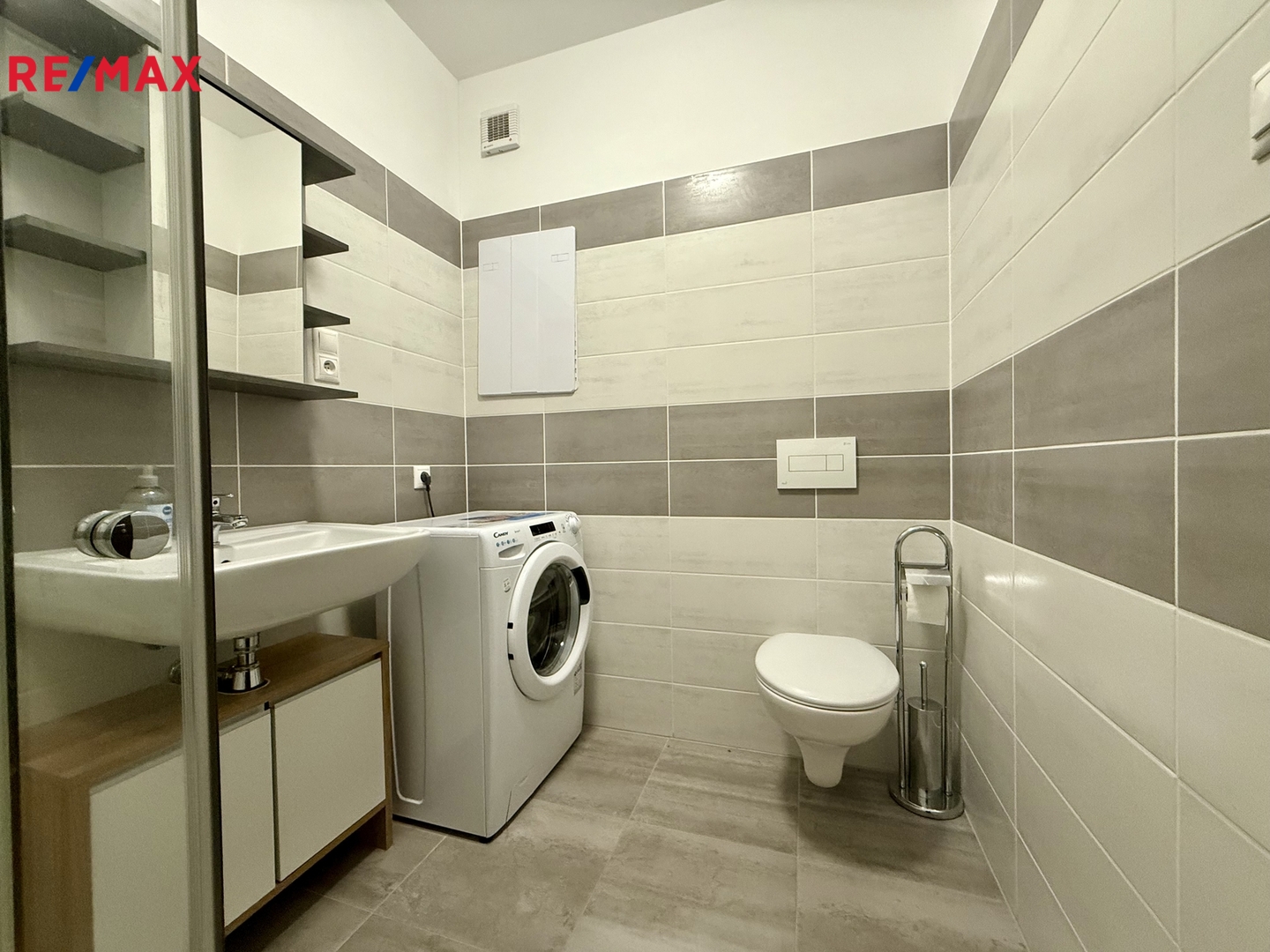 • koupelna se sprchovým koutem, toaletou, topným žebříkem a pračkou